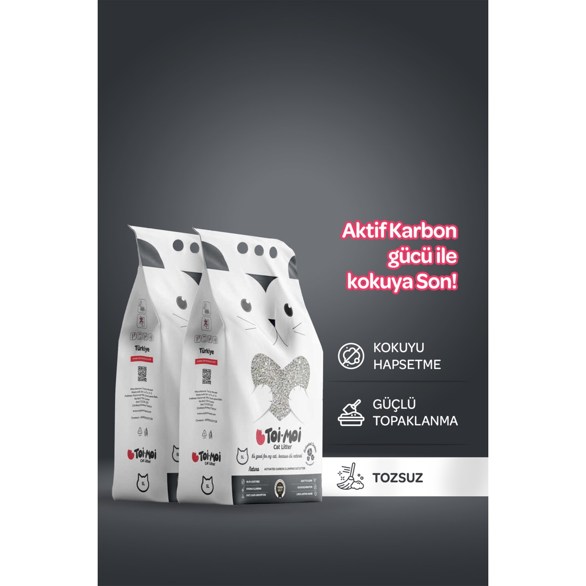 Toi Moi, sadece tozsuz olmakla kalmaz; aynı zamanda hızlı topaklanır, kötü kokuları etkin bir şekilde hapseder, patilere ve tüylere yapışmaz ve uzun süreli bir kullanım imkânı sağlar. Kimyasal içermeyen, doğayı koruyan ve ekolojik bir seçim olan Toi Moi aktif karbon kedi kumunu güvenle tercih edebilirsiniz.