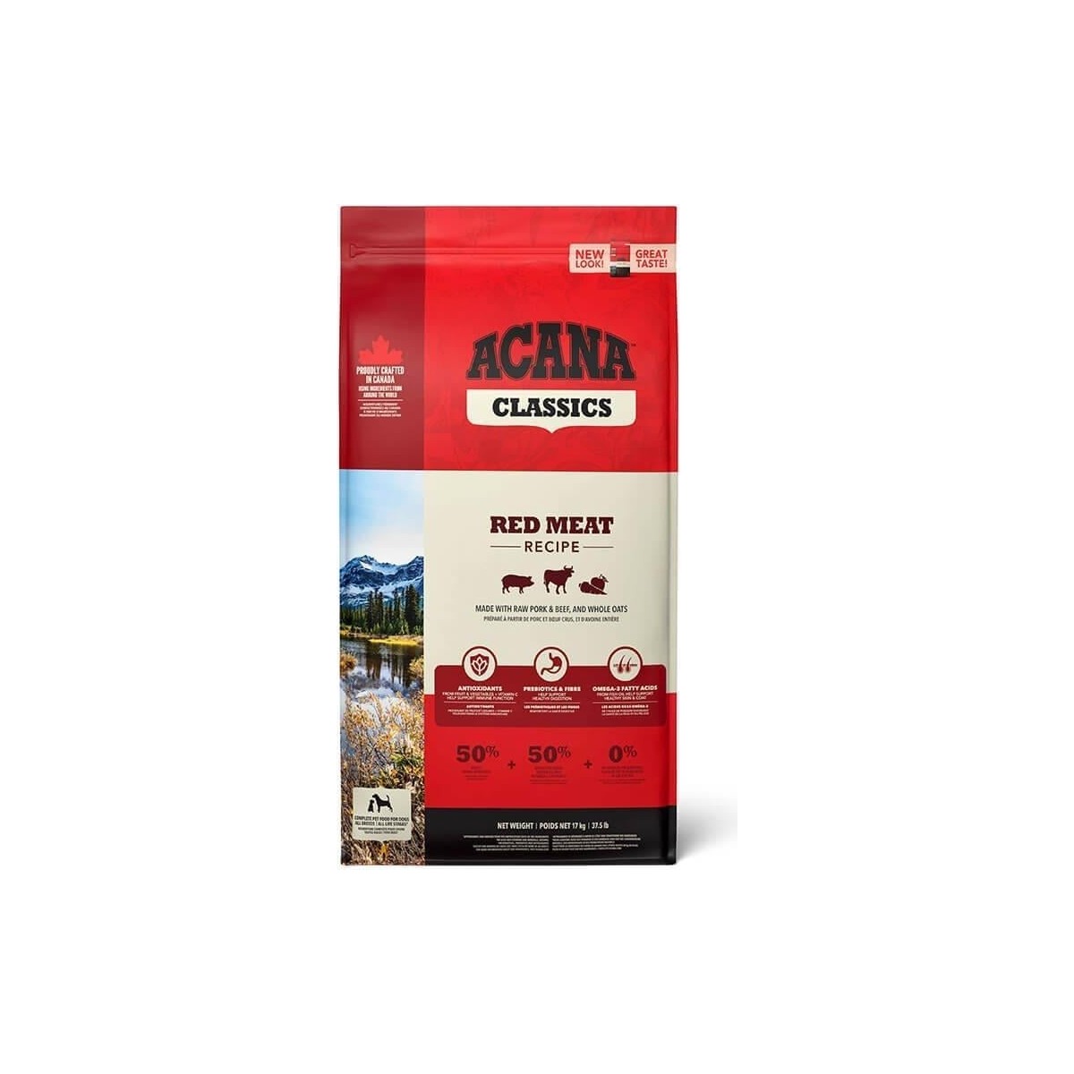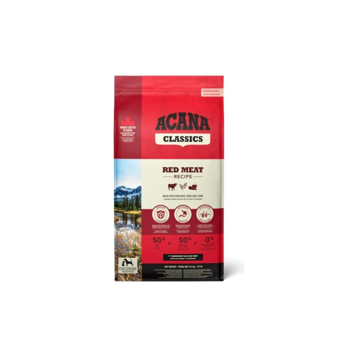 Acana Classic Red Köpek Maması İçeriği: Kuzu eti (23%), Çekilmiş yulaf (22%), Taze angus sığırı (5%), Taze yorkshire domuzu (5%), Kuzu yağı (5%), Bütün kırmızı mercimek, Bütün yeşil bezelye, Bütün yeşil mercimek, Çayırda beslenmiş çiğ kuzu eti (4%), Bütün yulaf, Taze sığır ciğeri (2%), Domuz eti (2%), Ringa balığı yağı (2%), Taze domuz ciğeri (2%), Bütün garbanzo nohutu, Bütün sarı bezelye, Güneşte kurutulmuş yonca, Mercimek lifi, Taze sığır işkembesi (1%), Kurtulmuş esmer su yosunu, Taze kabak, Taze bal kabağı, Taze yaban havucu, Taze yeşil kıvırcık lahana , Taze ıspanak, Taze havuç, Taze kırmızı lezzetli elma, Taze barlett armudu, Dondurularak-kurutulmuş sığır ciğeri (0.1%), Taze kızılcık, Taze yaban mersini, Radika kökü, Zerdeçal kökü, Devedikeni, Dulavraotu kökü, Lavanta , Hatmi kökü, Kuşburnu .