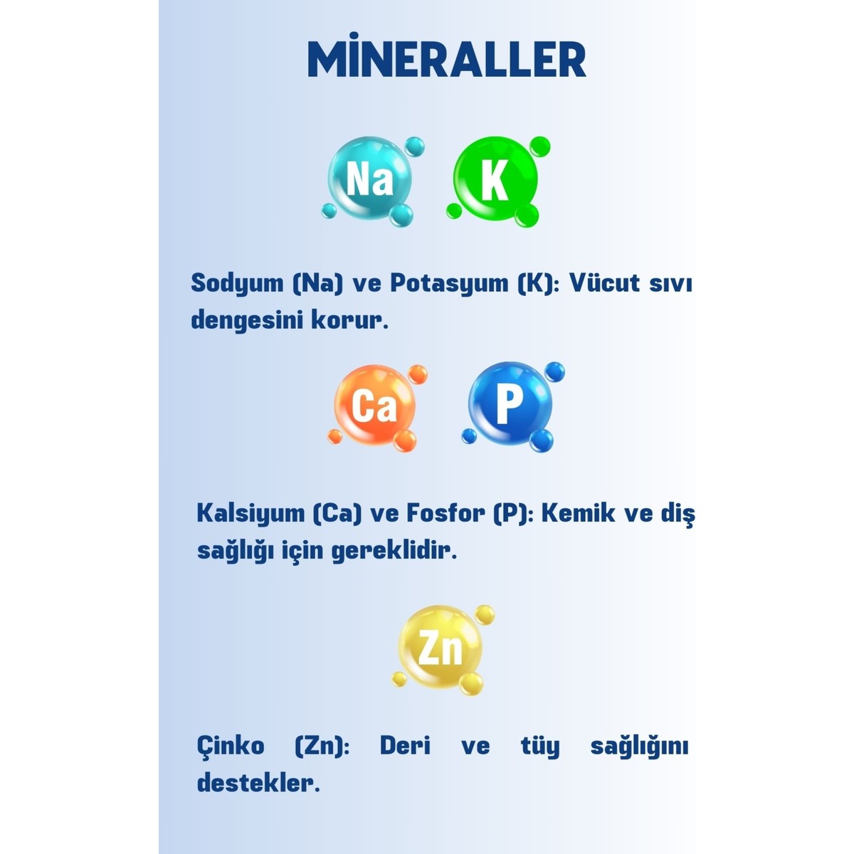 3. Mineraller:&NbspSodyum (Na), Potasyum (K), Kalsiyum (Ca) Ve Fosfor (P), Çinko (Zn), Demir (Fe), Bakır (Cu), Kobalt (Co), Manganez (Mn) Ve İyot (I)
