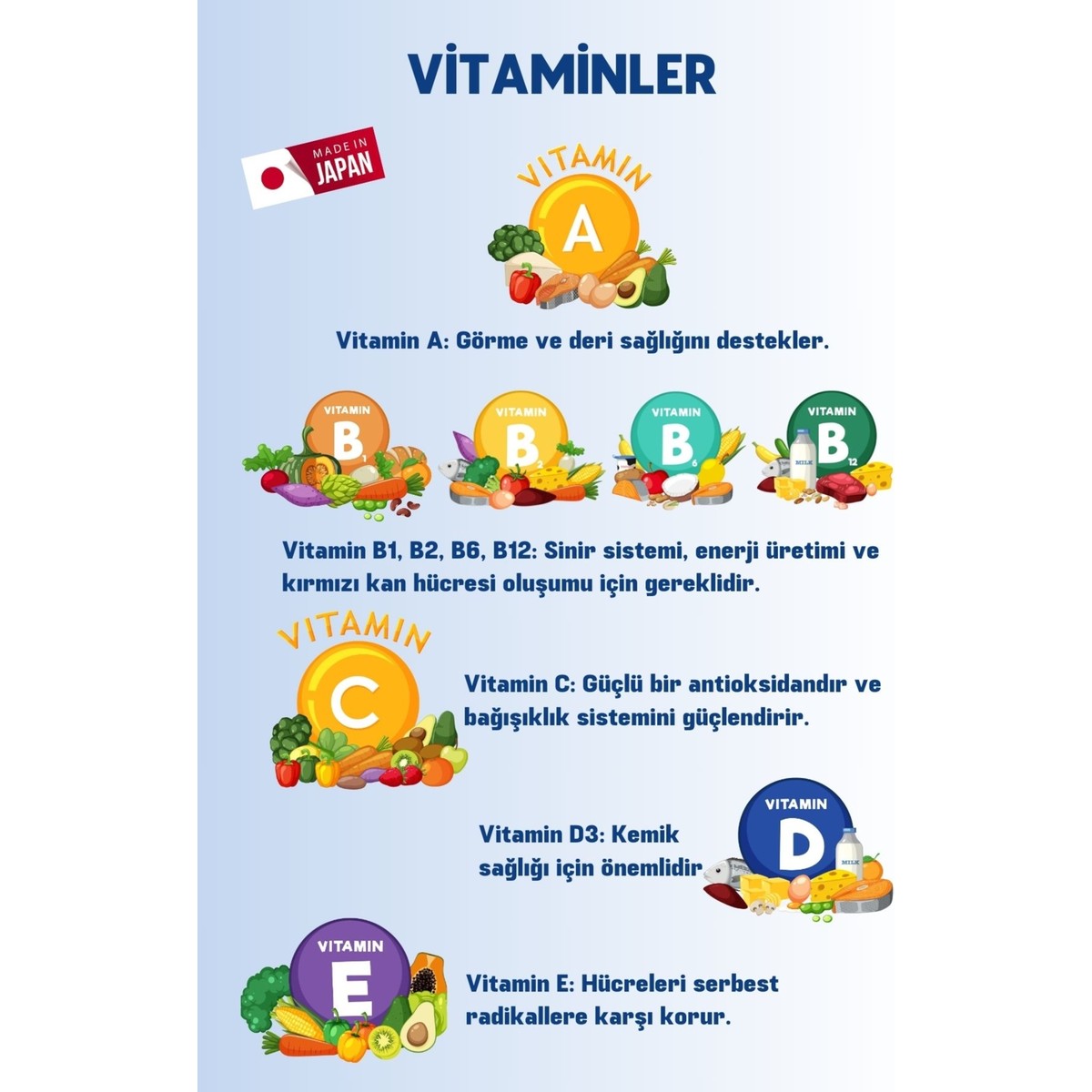 2. Vitaminler: Vitamin B1, B2, B6, B12 , C, D3, E, K3, Nikotinik Asit (B3), Pantotenik Asit (B5), Biyotin (B7 Vitamini), Kolin ve Folik Asit