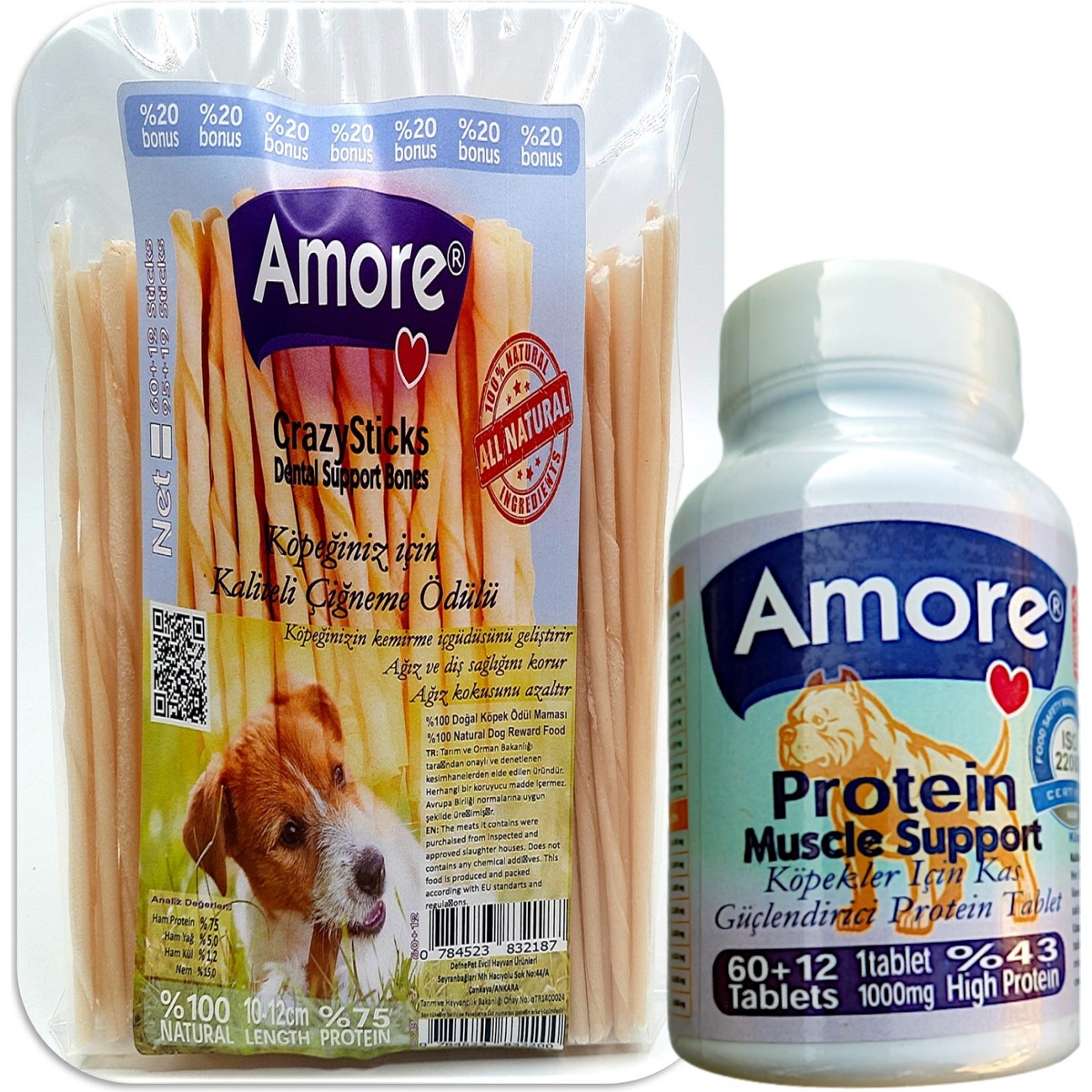 Amore Köpek Protein Vitamin Tablet 72LI Kas Desteği ve Crazy Sticks 114LÜ Çiğneme Ödül Çubukları
