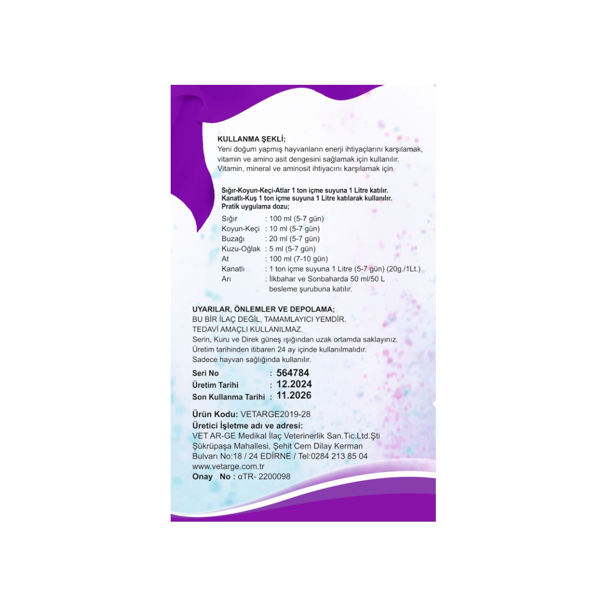 Yeni dogum yapmig hayvanlarn enerji ihtiyaçlanni karsilarak,vitamin ve amino asit dengesini saglamak için kullanilir.Vitamin, mineral ve aminosit ihtiyacini karsilamak için Sigir-Koyun-Keçi-Atlar 1 ton içme suyuna 1 Litre katilir.Kanathlarda 1 ton içme suyuna 1 Litre katilarak kullanilir.