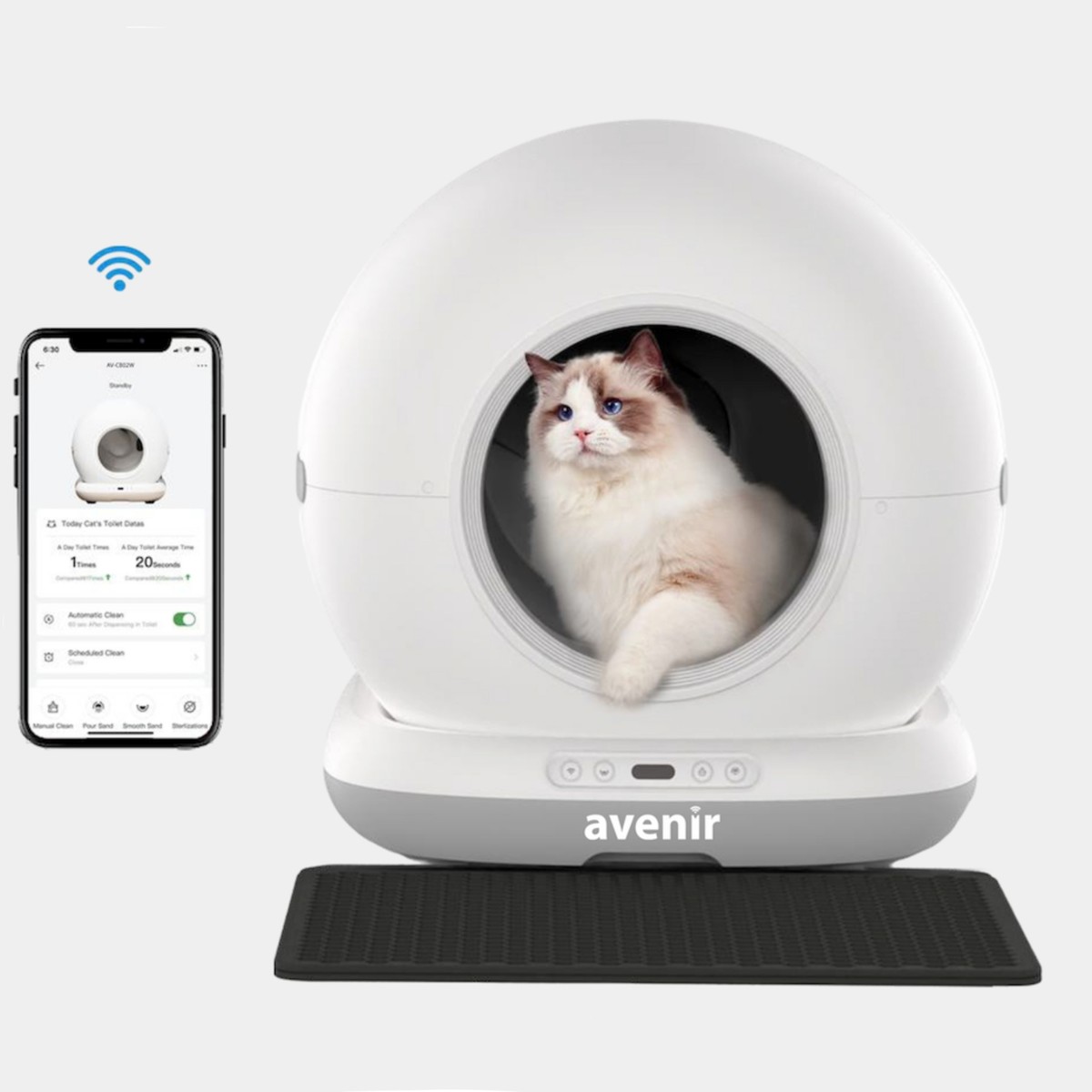 AVENİR AV-CB02W Akıllı Otomatik Kedi Tuvaleti, 75lt Hazne, 7lt Çöp haznesi, Ağırlık sensörlü + Elekli Kum Paspası Hediyeli (Gri), App Kontrol Koku Yapmayan Kum Kabı