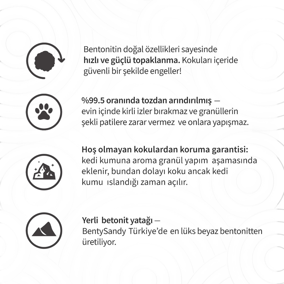 – %100 doğal, beyaz bentonit minerali ve bebek pudrası kokusunun bileşimi sayesinde daha temiz ve uzun süreli kullanıma uygun kedi kumudur;