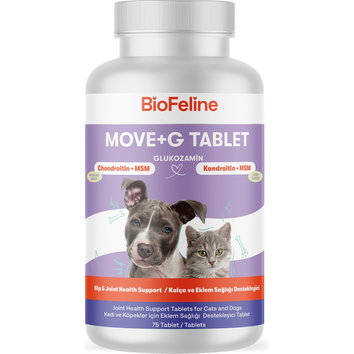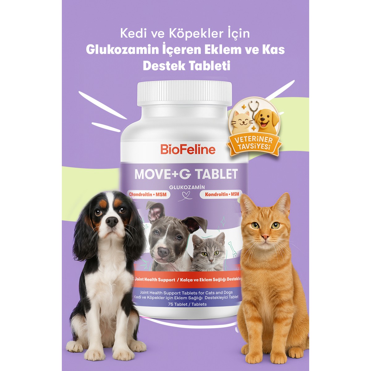 Kedi ve Köpekler için Eklem, Kas ve Eklem Sıvısı Destek Tableti (75 Tablet) Glukozamin, MSM ve C Vitamini ile Dayanıklı ve Sağlıklı Kas ve İskelet Yapısı… Biofeline Move+G, kedi ve köpekler için, eklem ve kıkırdak hasarlarında onarıcı etki yapan, yangı gidererek ağrıyı azaltan, eklem destek tabletidir. Eklem hareketleri ve kıkırdaklarının üretimine ve yeniden oluşumuna yardımcı, glukozamin, MSM ve antioksidanlar içermektedir. İçeriğindeki MSM (metil sülfonil metan), eklem ve kıkırdak çevresindeki bağ dokusunu güçlendiren sülfür içermektedir. MSM’nin ayrıca yangı azaltıcı etkisi olduğu bilinmekte ve ağrıları azaltmaktadır. Kıkırdak ve kemik sağlığını desteklemek için gerekli olan kolajen oluşumuna yardımcı C vitamini içermektedir. C vitamini aynı zamanda doğal antioksidan kaynağıdır, vücuttaki zararlı maddeleri engeller. Güçlü kombinasyonu sayesinde kedi ve köpeklerin günlük aktivitelerini destekler. Kas gelişimi için gerekli aminoasitleri içermektedir. İçeriğindeki hyluoronic asit eklemleri ve sinirleri yumuşatır. Bağ dokusunda esneklik, sağlamlık ve nem kazandırır.