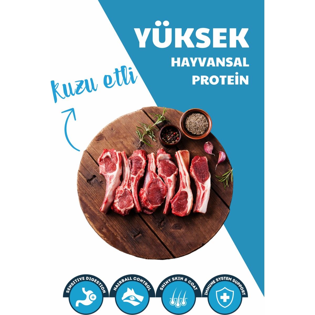 İçindekiler : İşlenmiş Hayvansal Protein, Mısır, İşlenmiş Kuzu Proteini, Buğday, Hayvansal Yağ, Buğday kepeği, Mısır Gluteni, Pirinç, Kurutulmuş Şeker Pancarı, Ciğer Aroması, Peynir Altı Suyu, Kurutulmuş Bira Mayası, Taurin, Keten Tohumu, Tuz