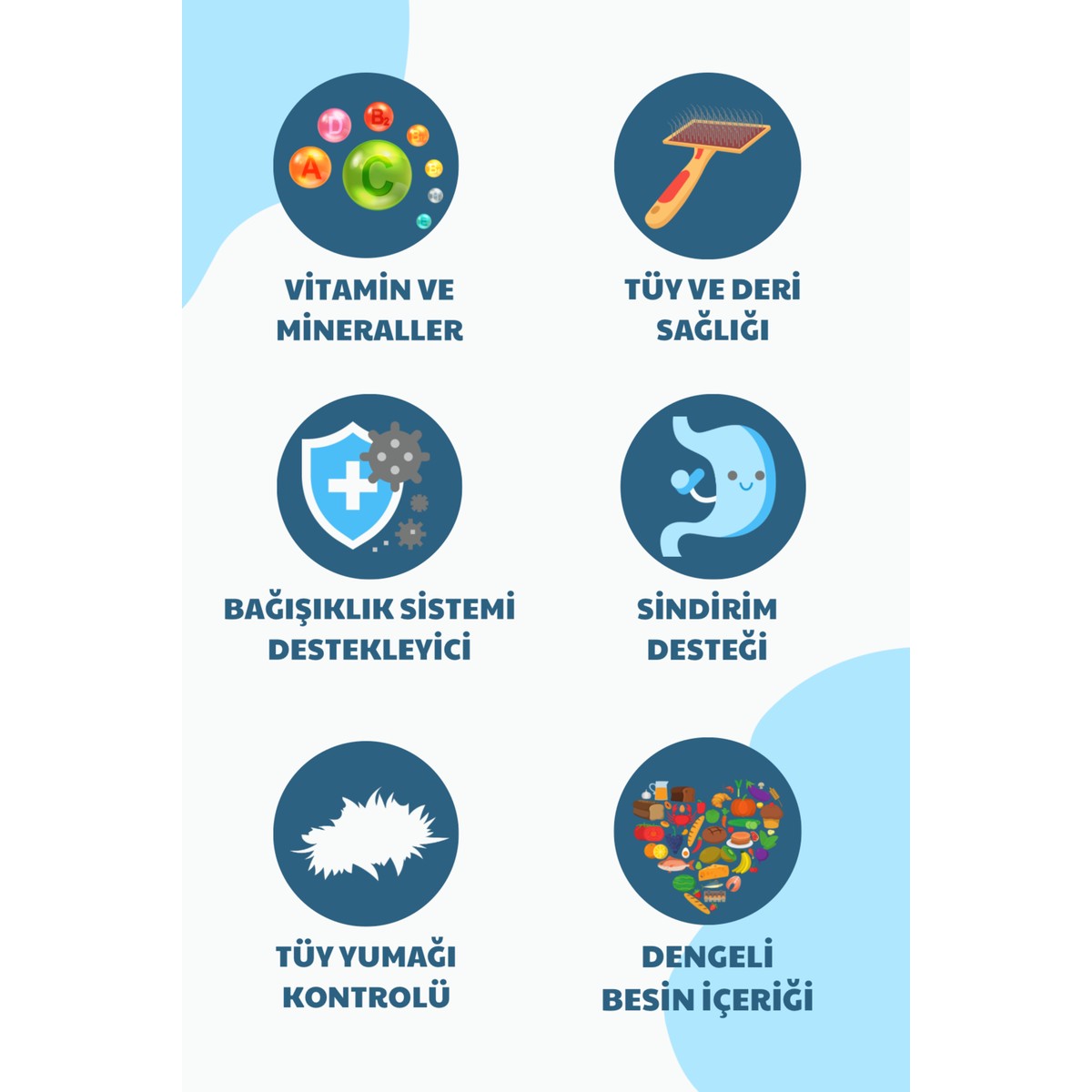 Vitaminler / Vitamins : Vit.A, Vit.D, Vit.E, Vit.C, Vit.B1, Vit.B2, Vit.B3 (Niacin), Vit.B6, Vit.B12, Vit.B7 ( biotin ), Vit.B9 ( Folic Asid ), Vit.K, Choline, Calcium Pantotetan