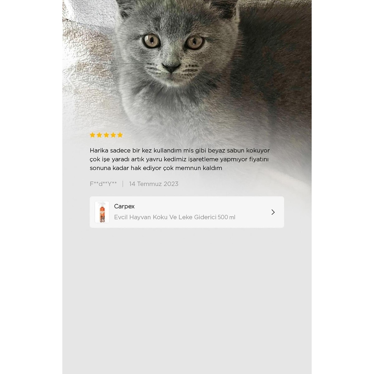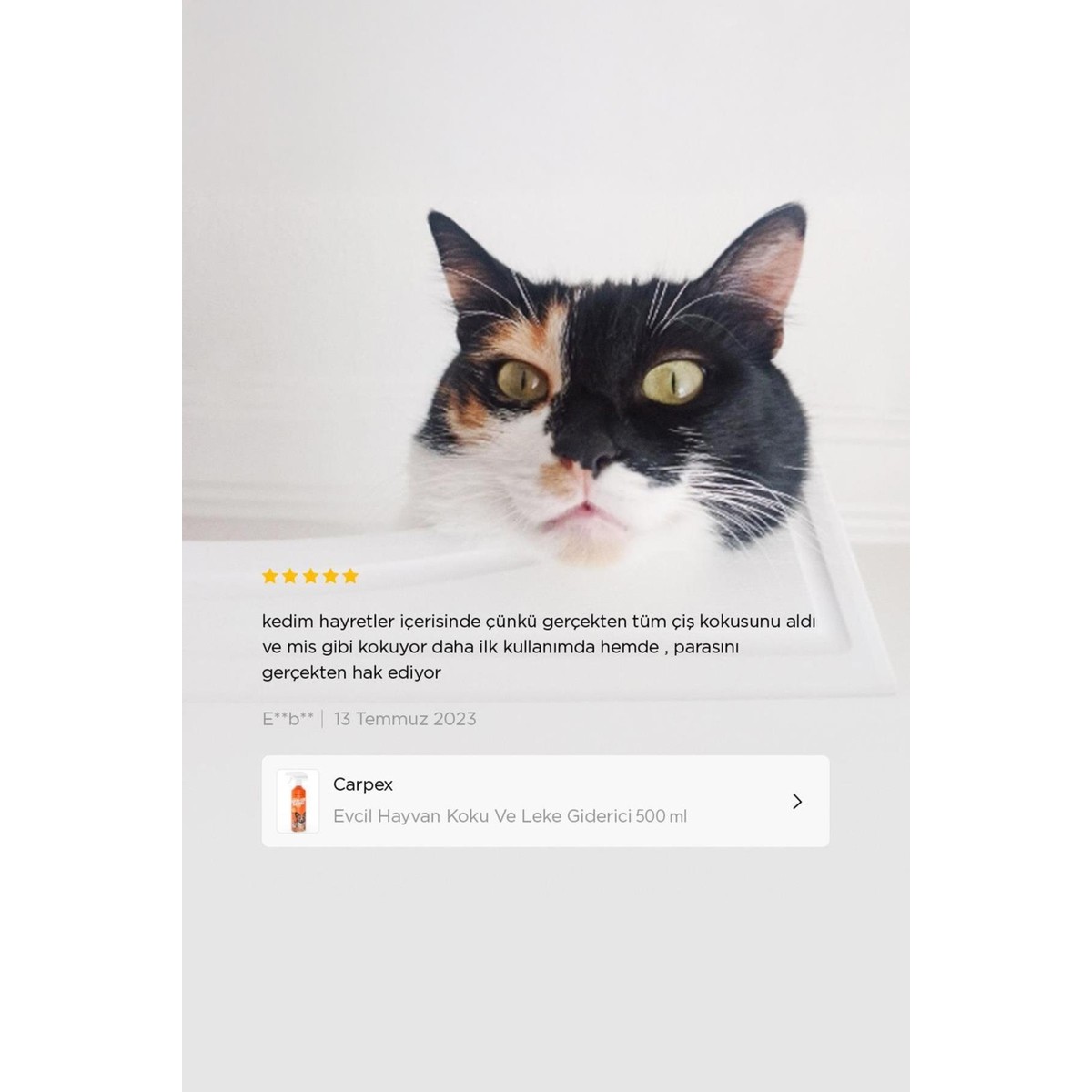 Çok çok memnun kaldım erkek kedim kısırlaştırma süreci biraz uzun oldu çok koku bırakmıştı yıkamaya gönderdiğim halde çıkmamıştı koku koltuk ve sandalyemden ama carpex sayesinde evim eski güzel kokusuna kavuştu teşekkür ederim