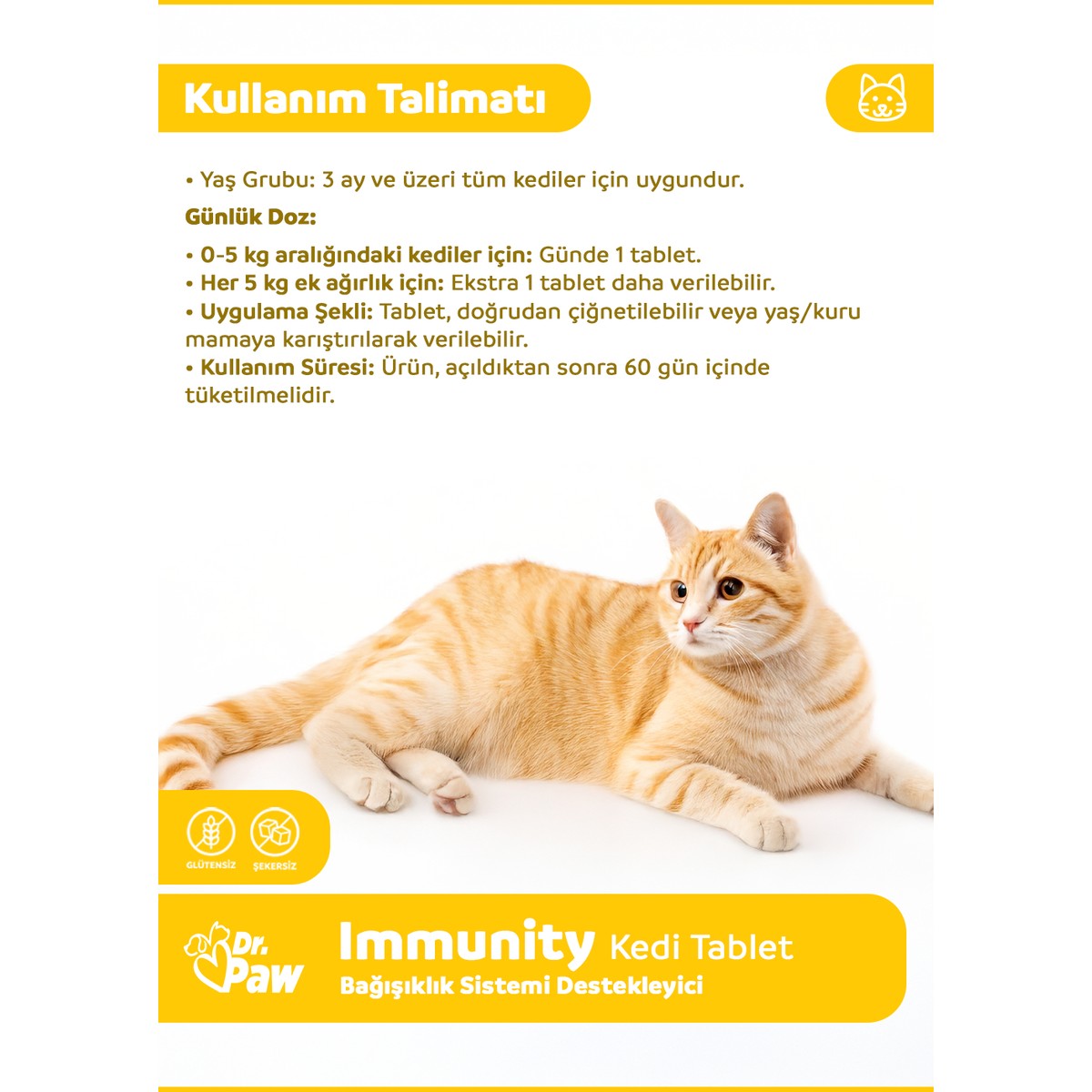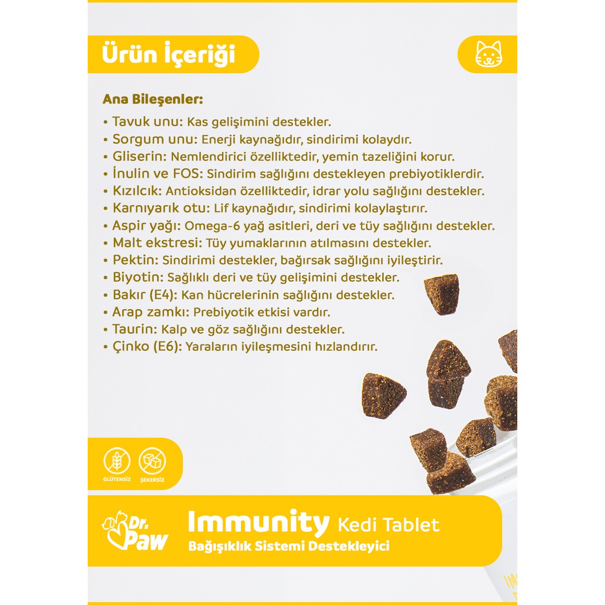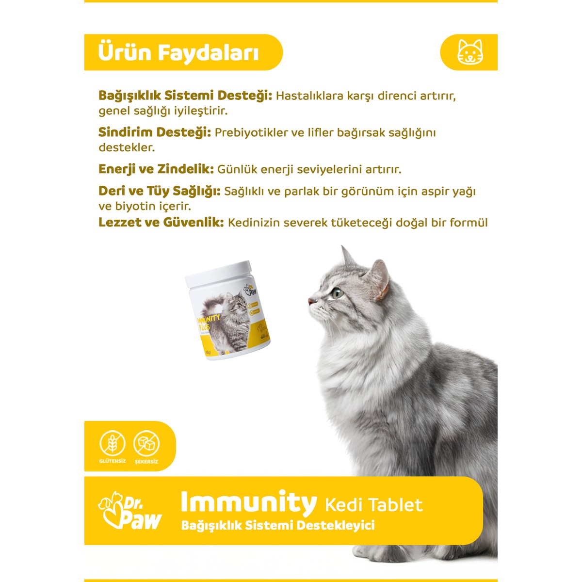 Kediler, ev ortamında düzenli bakım ve dengeli beslenme sayesinde daha uzun ve sağlıklı bir yaşam sürebilir. Özellikle hassas dönemlerde sağlıklarını destekleyen takviyeler büyük önem taşır. Veteriner hekimlerin uzmanlığıyla geliştirilen ve gıda kalitesinde (food grade) içeriklerle üretilen Dr. Paw – Immunity Plus, glütensiz ve şekersiz formülü sayesinde kedinizin genel sağlığını korumaya yardımcı ideal bir üründür. Çiğnenebilir tablet formundaki bu ürün, ödül maması tadında kolayca tüketilebilir.