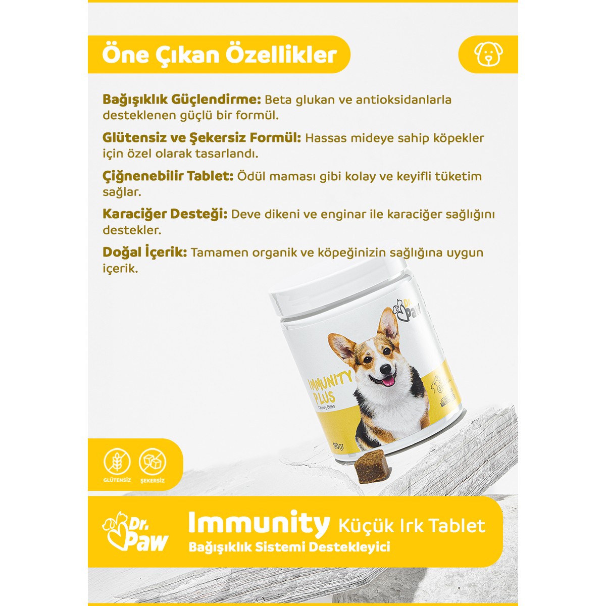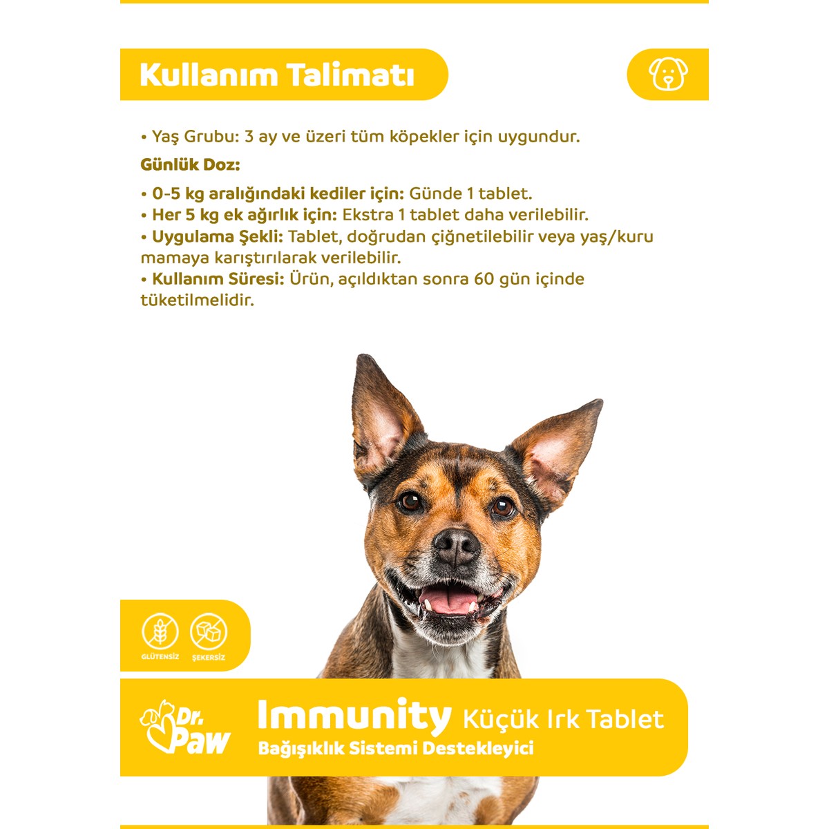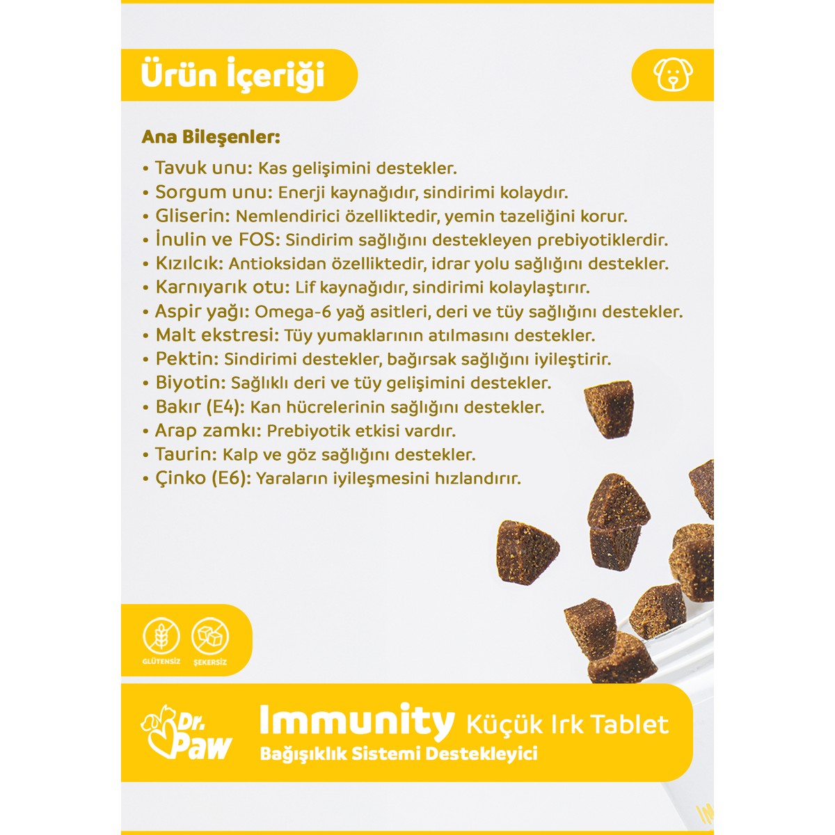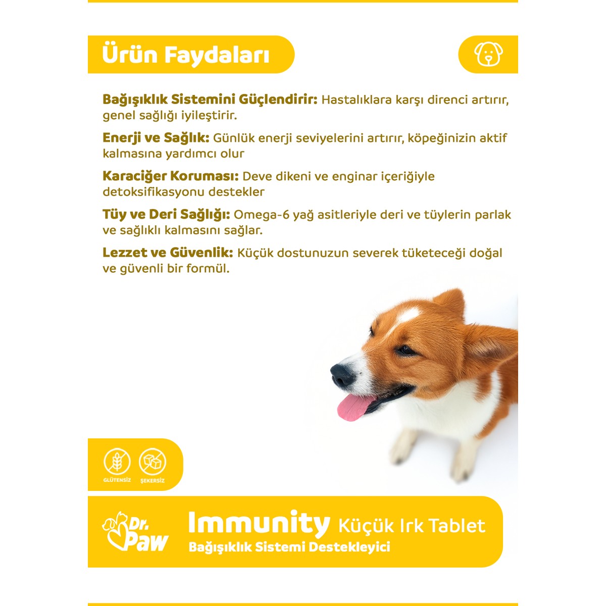 Dr. Paw Immunity Plus Küçük Irk Köpekler için Glütensiz ve Şekersiz Immün ve Enerji Desteği (60 Tablet, 90 Gr)