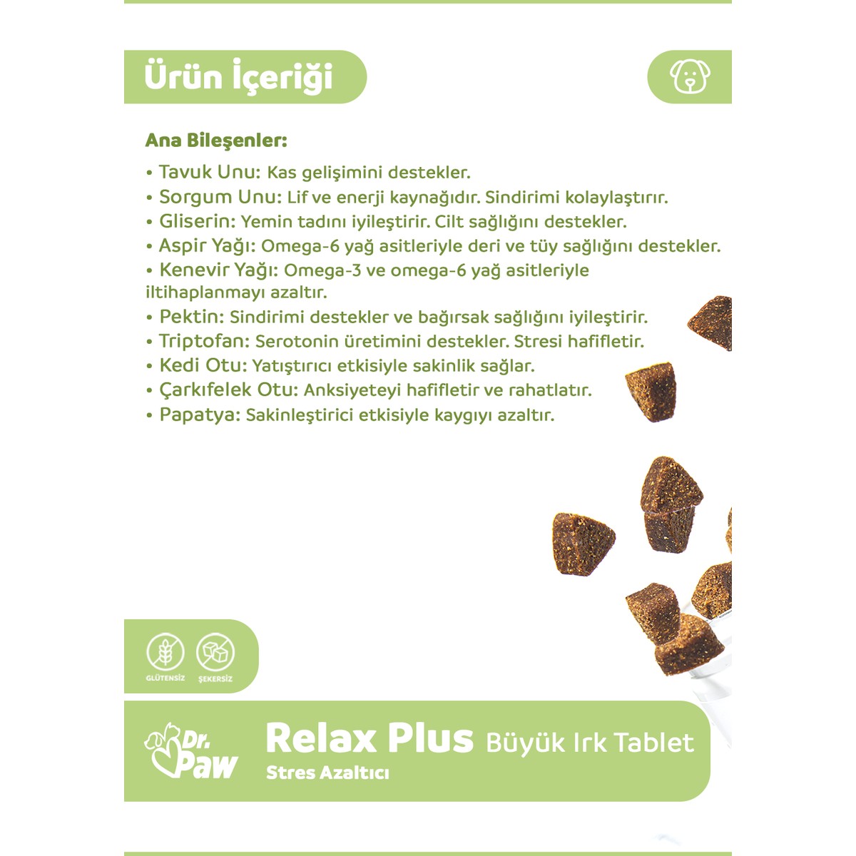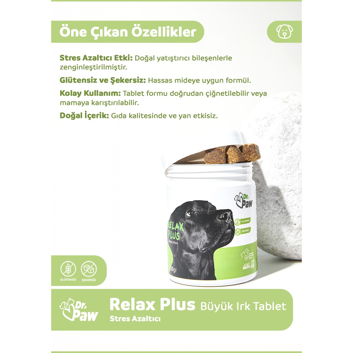Köpeklerin günlük yaşamlarında karşılaştıkları birçok durum, onların huzursuz hissetmesine neden olabilir. Evde yalnız kalma, taşınma, seyahat, havai fişekler ve sahip değişimi gibi faktörler, patili dostlarınız için zorlayıcı olabilir. Veteriner hekimlerin uzmanlığıyla geliştirilen ve gıda kalitesinde (food grade) içeriklerle üretilen Dr. Paw – Relax Plus, glütensiz ve şekersiz formülüyle köpeğinizin zorlu durumlarla baş etmesine yardımcı olur. Ödül maması tadındaki bu çiğnenebilir tabletler, köpeğinizin günlük rutini için ideal bir destek sunar.