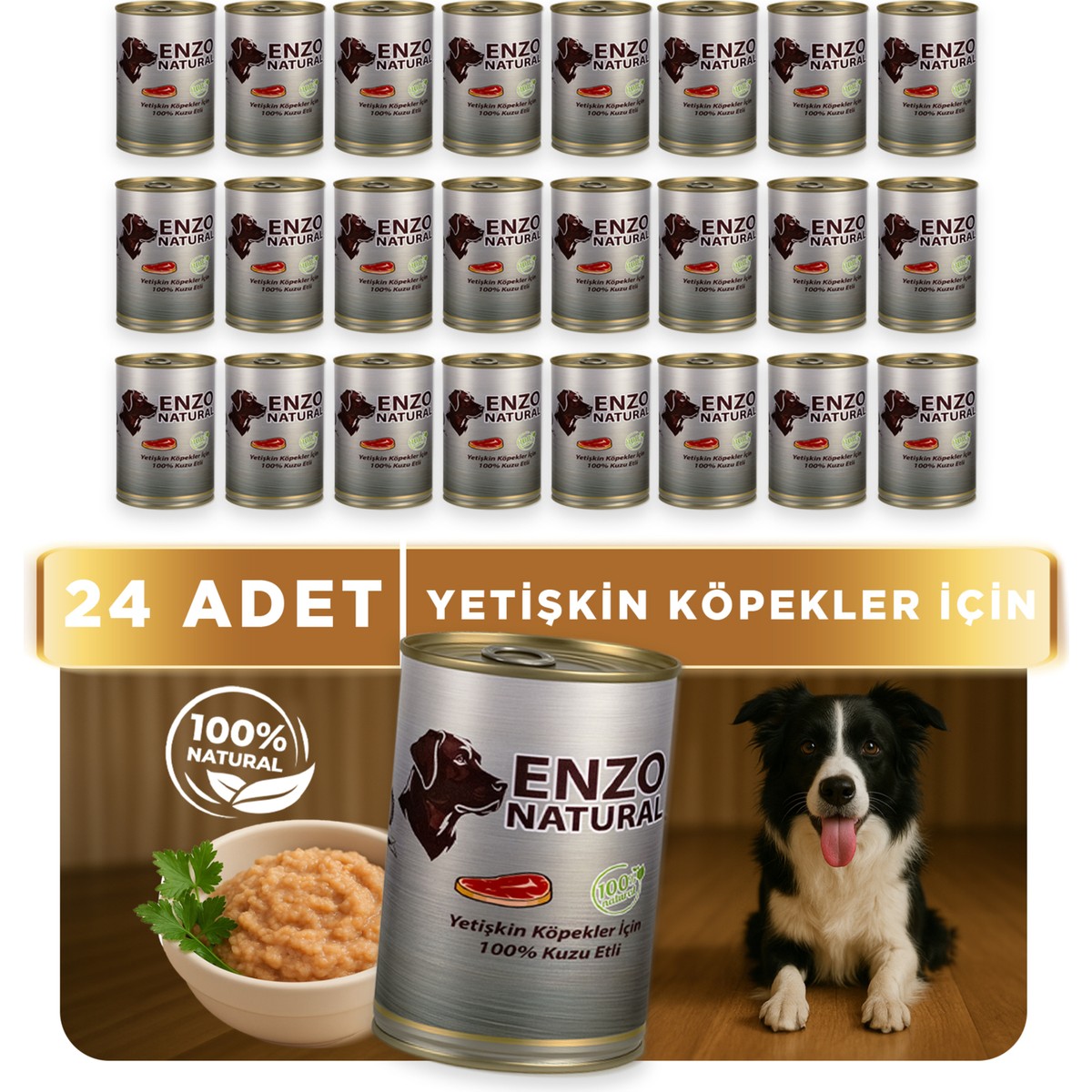 Kuzu etli Enzo Natural konserve yaş köpek mamamız patili dostlarımızın tamamen doğal besinlerle ihtiyaç duydukları sağlıklı ve enerjik bir yaşam sürmelerine destek olur.