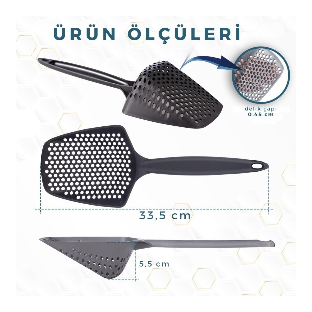küreğin deliklerini kullandığım kedi kumu için fazla küçük buldum. maalesef işime yaramadı.
