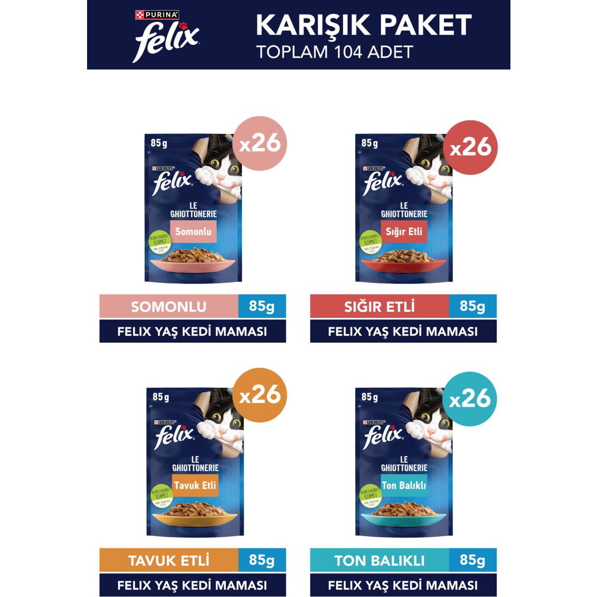 Ürün yenilenmiş Felix paketleridir -Minumum 4 çeşit 85 gr x 104 adet adet gönderim yapılacaktır -4 kutu x 26 adet şeklinde sevk edilecektir.