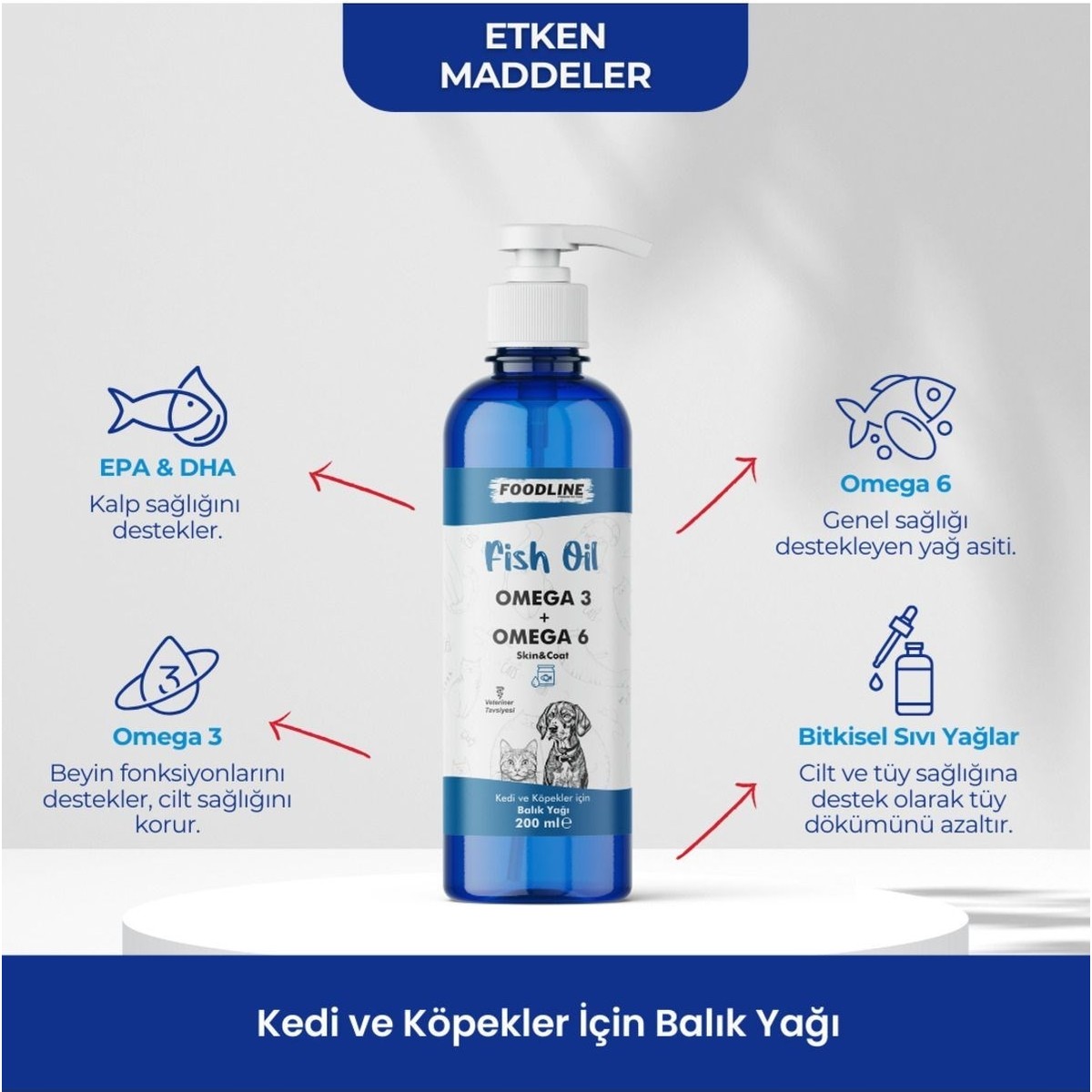 Foodline Fish Oil, kedi ve köpeklerin Omega-3 ve Omega-6 esansiyel doymamış yağ asidi ihtiyaçlarını karşılamak için üretilen özel bir üründür. Foodline Fish Oil, kedi ve köpeklerin kaliteli ve sağlıklı bir yaşam sürmesine destek olur. Tüy dökülmelerinde, diş ve diş eti sağlığında, alerjik deri rahatsızlıklarında, Immun sisteminin güçlendirilmesinde, kalp ve göz hastalıklarında etkili bir destektir. Kan basıncını, hazım ve dolaşım sistemini düzenlemektedir. Kemikleri güçlendirmekte, kabızlığın sonlandırılmasına destek olmaktadır.
