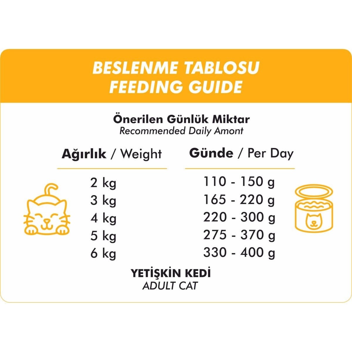 Beslenme tavsiyeleri: Önerilen günlük miktar beslenme tablosunda belirtilmiştir. Her zaman bir kase taze su verin ,oda sıcaklığında muhafaza ve servis edin. Açıldıktan sonra buzdolabında saklayın ve 72 saat içinde tüketin. Konserve deforme olmuşsa kullanmayın. Ambalajın üzerindeki nden önce tüketiniz. ve lot numarası için kapaktaki koda bakın.