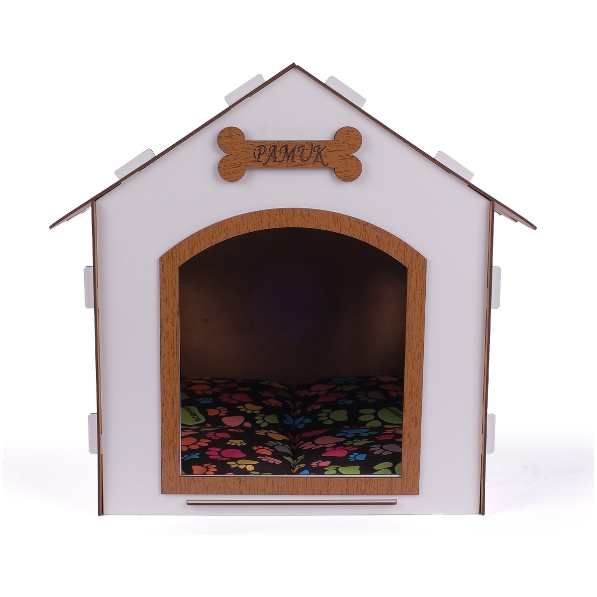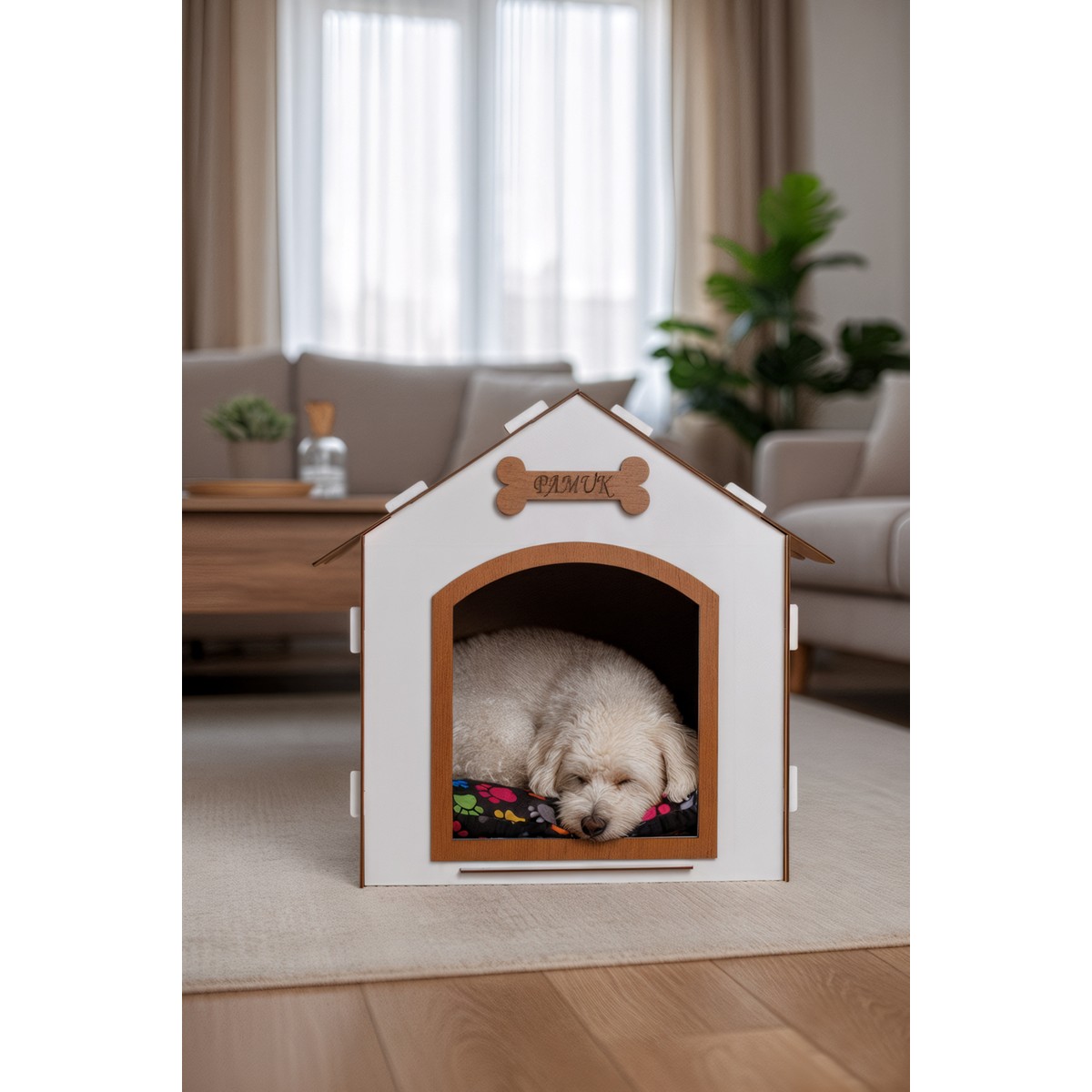 Ahşap Özel Isim Baskılı Dekoratif Köpek Evi-Kulübesi, Küçük Irk Köpekler Için Kulübe, Köpek Kulübesi Beyaz-Kahverengi