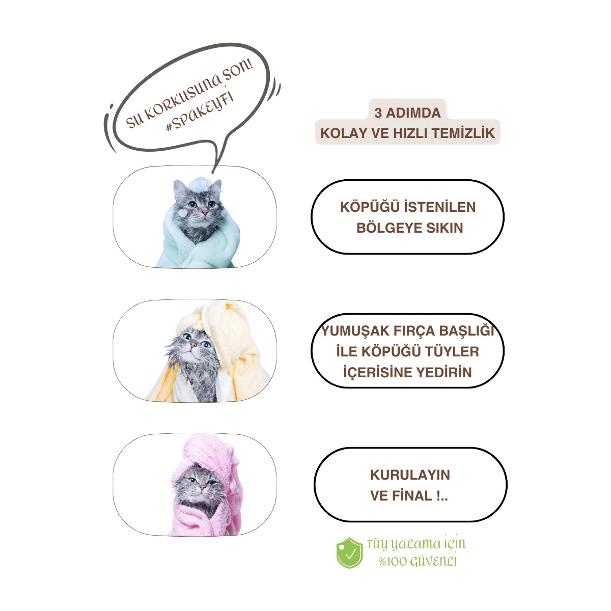 Vegan ve organik içerikli temizleme köpüğümüz durulamaya gerek duyulmadan hızlı ve kolay temizlik sağlar. Organik gül, lavanta, mersin yaprağı, rezene suları ve aloe vera ile zenginleştirilmiş formülümüz tüylü dostlarınızı nazikçe temizler. Antioksidan ve antiseptik olan yeşil çay ve kekik içerikleri sayesinde dostlarınızın tüylerini arındırır ve güzelleştirir.