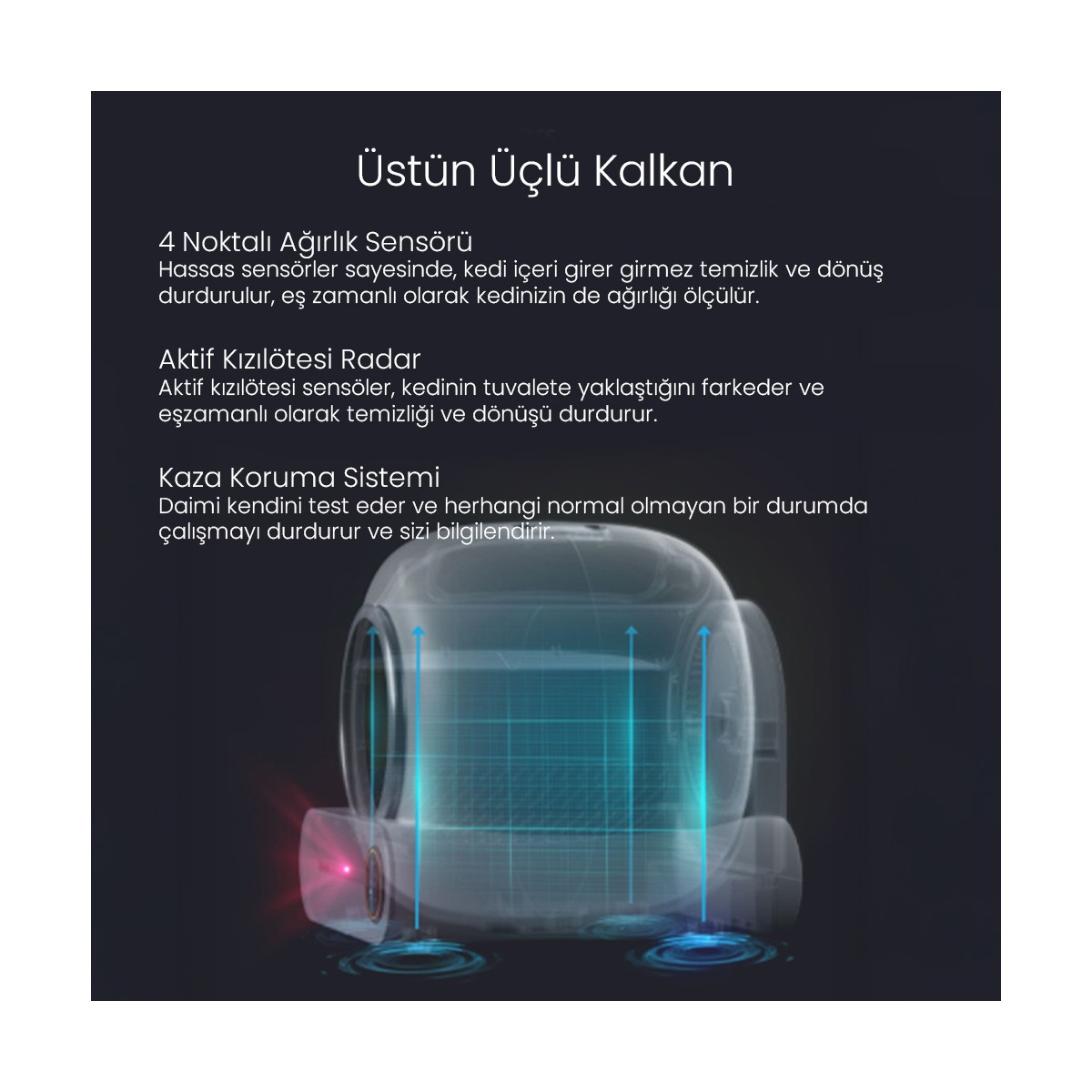 başta çok kullanışsız geldi ama kullanınca anladım harika bir cihaz en ufak bir koku yok tertemiz dışarıya kumda atamıyor kedi