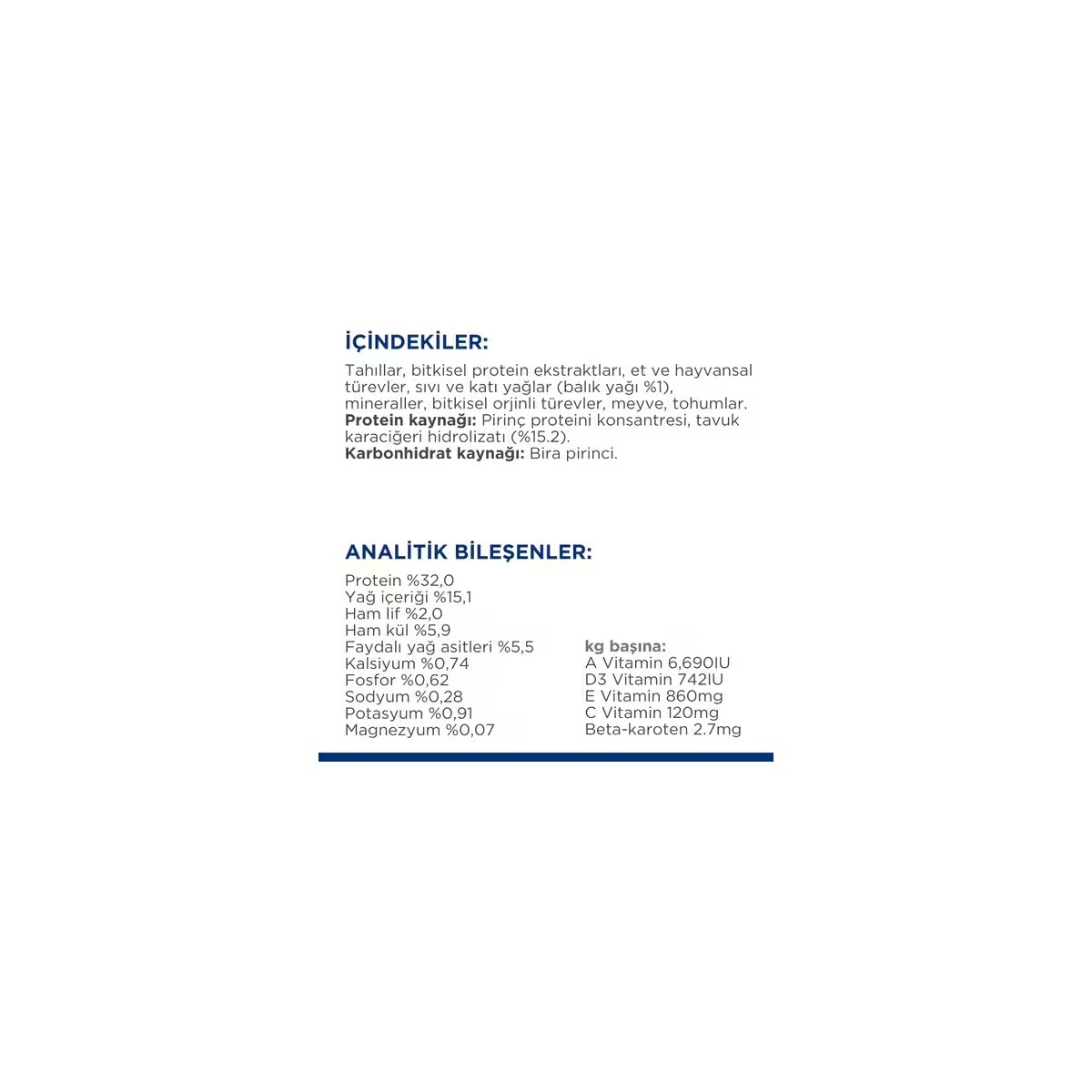 İÇİNDEKİLER: Tahıllar, bitkisel protein ekstraktları, et ve hayvansal türevler, sıvı ve katı yağlar (balık yağı %1), mineraller, bitkisel kökenli türevler, meyve, tohumlar.