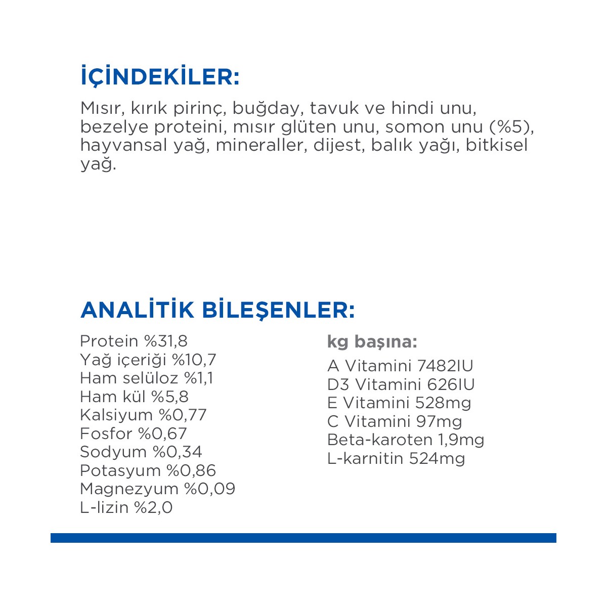 1-7 yaş aralığında, kısırlaştırılmış dişi ya da erkek yetişkin kedilerin tüm besinsel ihtiyaçlarını karşılamak için uzman veteriner hekimler tarafından geliştirilmiş tam mamadır. Kedinizin göz sağlığı için önem taşıyan balık eti içeriklidir. Kedinizin beslenme programına uygun şekilde kedinize sunmalı ve günlük yemesi gereken miktarı aşmamalısınız. Seçici kediler için yaş mama ile bir miktar karıştırılıp sunulabilinir. Detaylı Açıklama : * 1-7 yaş aralığındaki, kısırlaştırılmış dişi ya da erkek yaşlı kedilerin tüm besinsel ihtiyaçlarını karşılamak için uzman veteriner hekimler tarafından geliştirilmiş tam mama * Kilo alımını önlemeye yardımcı olan düşük enerji ve yağ oranı * Yağ yakımının hızlandırılmasında etkili L-karnitin katkısı * Yağsız kas ağırlığının korunmasına yardımcı L-lisin katkısı * Üriner sistemin sağlığını destekleyen ve böbrekleri koruyan dengeli mineral oranları ve idrar pH’ı * Destekleyen etkinliği klinik olarak kanıtlanmış antioksidan formül Kısırlaştırılmış kedilerin her hayat evresinde ideal ağılıklarını ve sağlıklarını korumalarına yardımcı olan kusursuz beslenme. Kısırlaştırılmış kedinizin tüm hayatı boyunca özel beslenme ihtiyaçları bulunmaktadır. İşte bu nedenle Hills Science Plan Sterilised Cat kedinizin uzun süreli beslenmesine uygun olarak, yetişkin ve yaşlı evrelerinde sağlığının korunubilmesi için formüle edilmiştir. Kedilerin sağlıklı ve fit olmasını sağlayan yüksek seviyelerde L-karnitin. Özellikle yaşlı kedilerde sağlıklı üriner sistem böbrek fonksiyonlarını destekleyen kontrollü mineral ve PH seviyeleri. Kedilerin vücutlarında yağ depolamalarını önlemesine yardımcı olan üyksek seviyelerde lizin ve kontrollü seviyede kalori. Yaşlanmaya bağlı ortaya çıkan serbest radikallerin nötralize edilmesine ve desteklenmesine yardımcı olan E ve C vitamini gibi antioksidanlar.