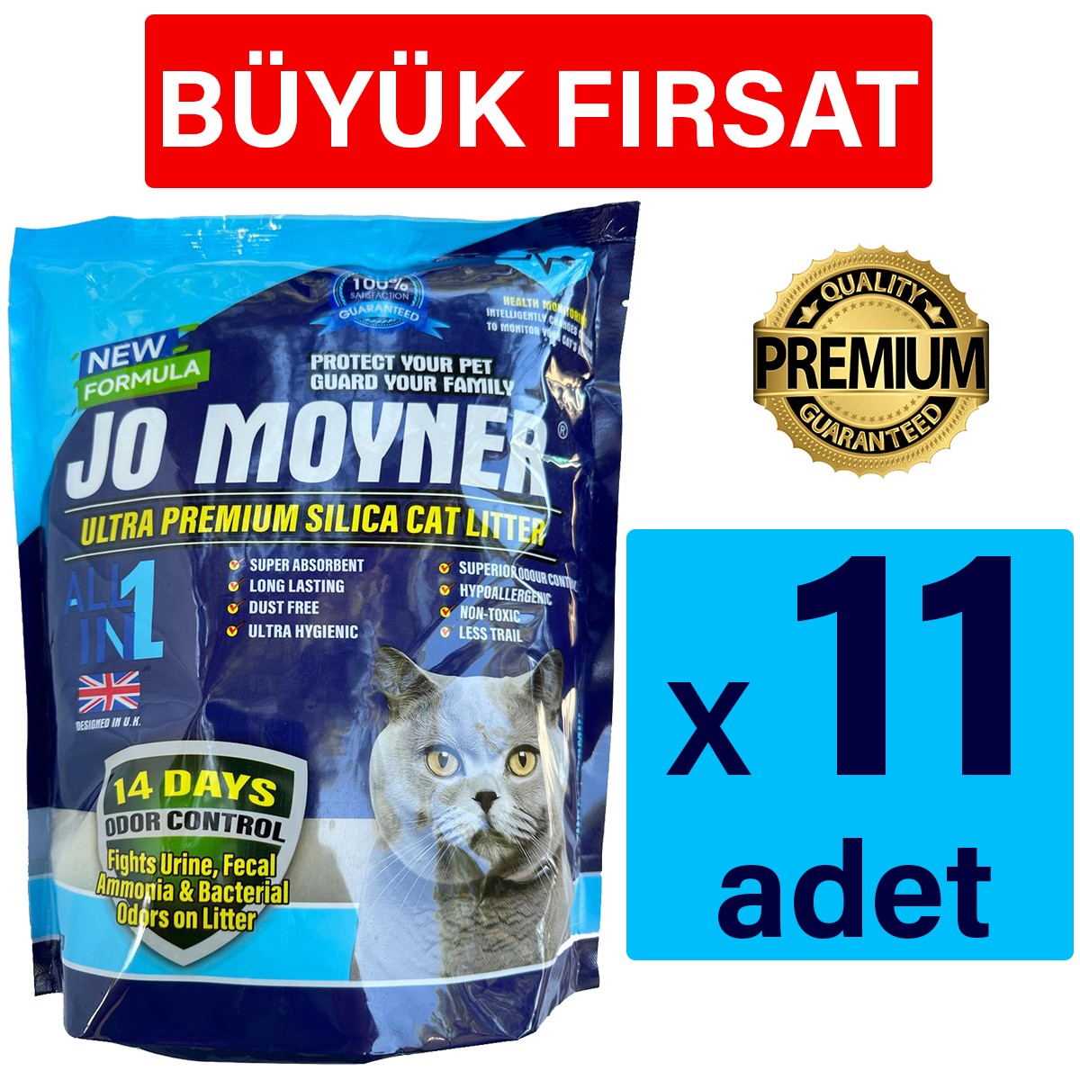Jo Moyner Premium Erken Teşhis Formüllü Renk Değiştiren Silika Kristal Kedi Kumu 4 Lt / 1.62Kg X 11 ADET (17,Kg)