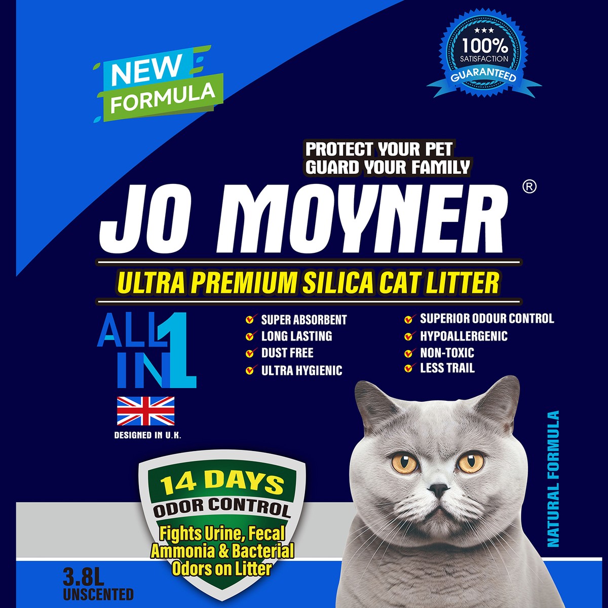 Jo Moyner silika kedi kumlarının genel özelliklerine sahiptir. Sıvı ve kokuyu yüksek derecede absorbe edebilen silika kedi kumunun her bir taneciği % 170 sıvı emme kapasitesine sahiptir. Küçük kristal tanecikleri antistatik özelliği sayesinde tüylere ve patilere yapışmaz, iz bırakmaz ve hassas patilere zarar vermez. Tozsuz, karışık taneli birinci kalite silika kedi kumudur. Kristal tanecikleri kuvars içermeyen ve toksik etkisi olmayan silika jelden yapılmış kedi kumudur.
