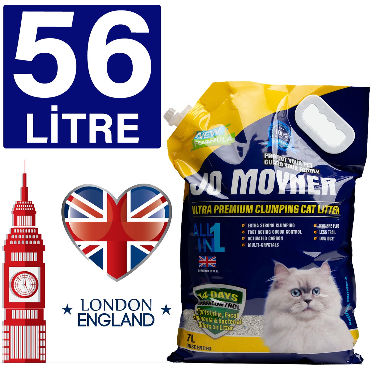 Jo Moyner Ultra Premium 56 Lt kedi kumu sayesinde sıradışı topaklanma ve emilim etkisi idrarın kum kutusunun dibine ulaşarak birikmesini ve kötü kokuların oluşmasını önler.