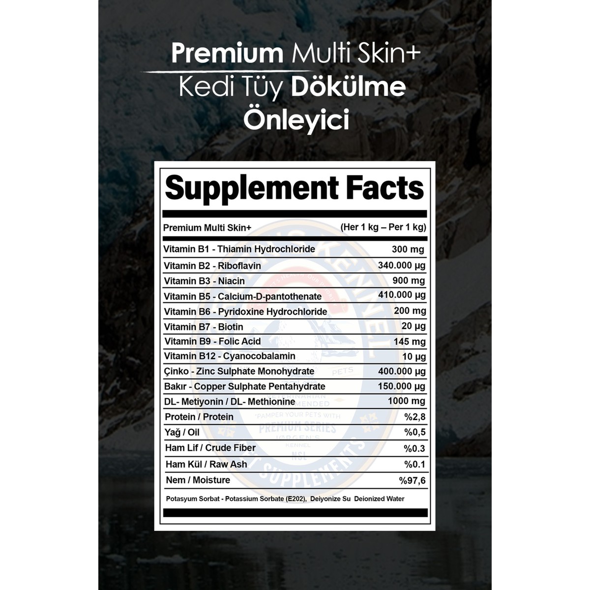 Cilt ve Tüy Sağlığı: Premium Multi Skin+, kedinizin cildini nemlendirir ve tüylerinin sağlıklı kalmasını sağlar.