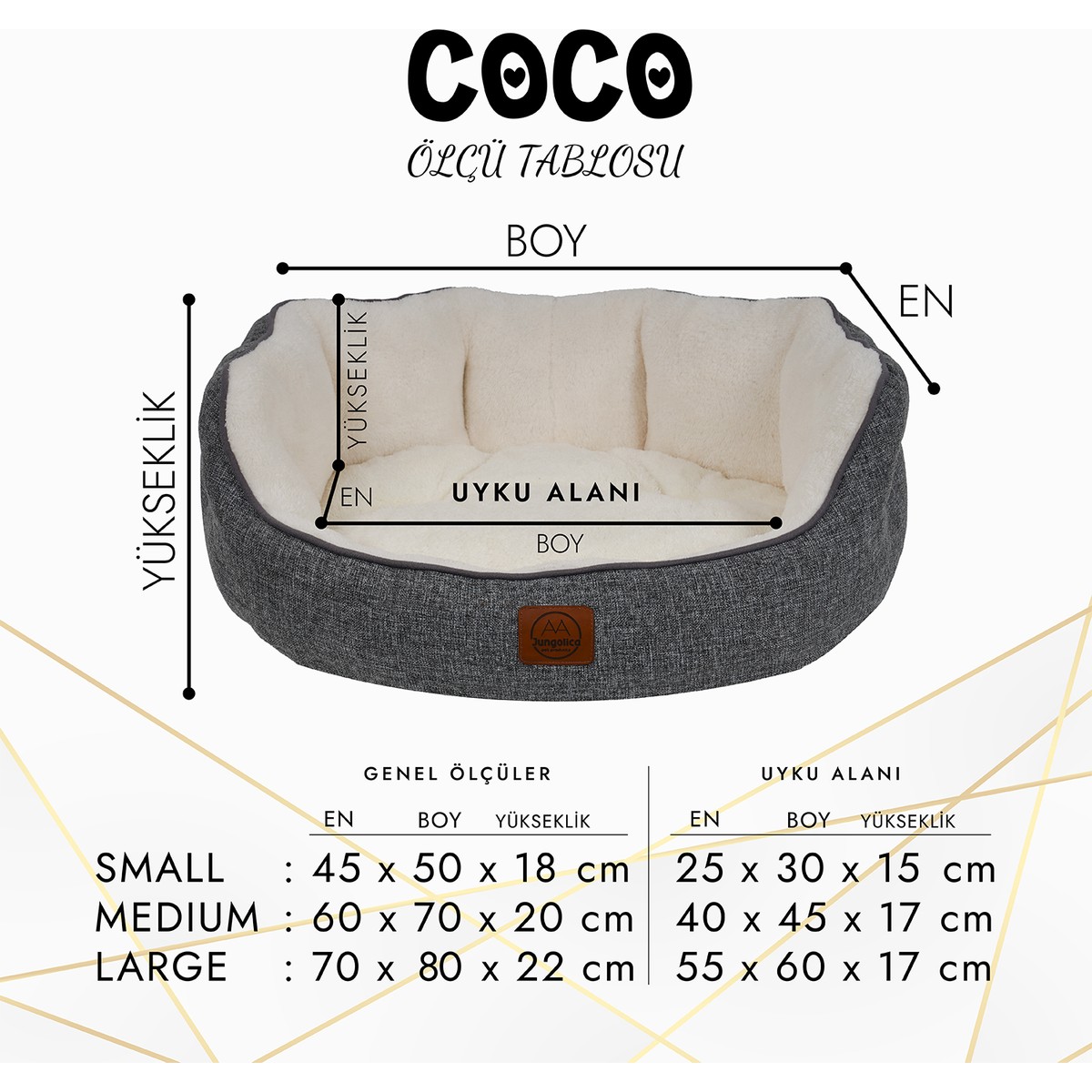 Coco, odanın herhangi bir köşesinde hem kediler hem de köpekler için özel bir uyku köşesi oluşturmak için mükemmel bir tasarımdır .Yükseltilmiş yan duvarlar köpeğin başı ve boynu için iyi bir destek ve yastıklama  sağlarken, hava akımına maruz kalmayı azaltır. Alçak ön kenar tasarımı kolay erişim içindir. Rahat iç kısım, rahatlık ve güvenlik hissi sunar.
