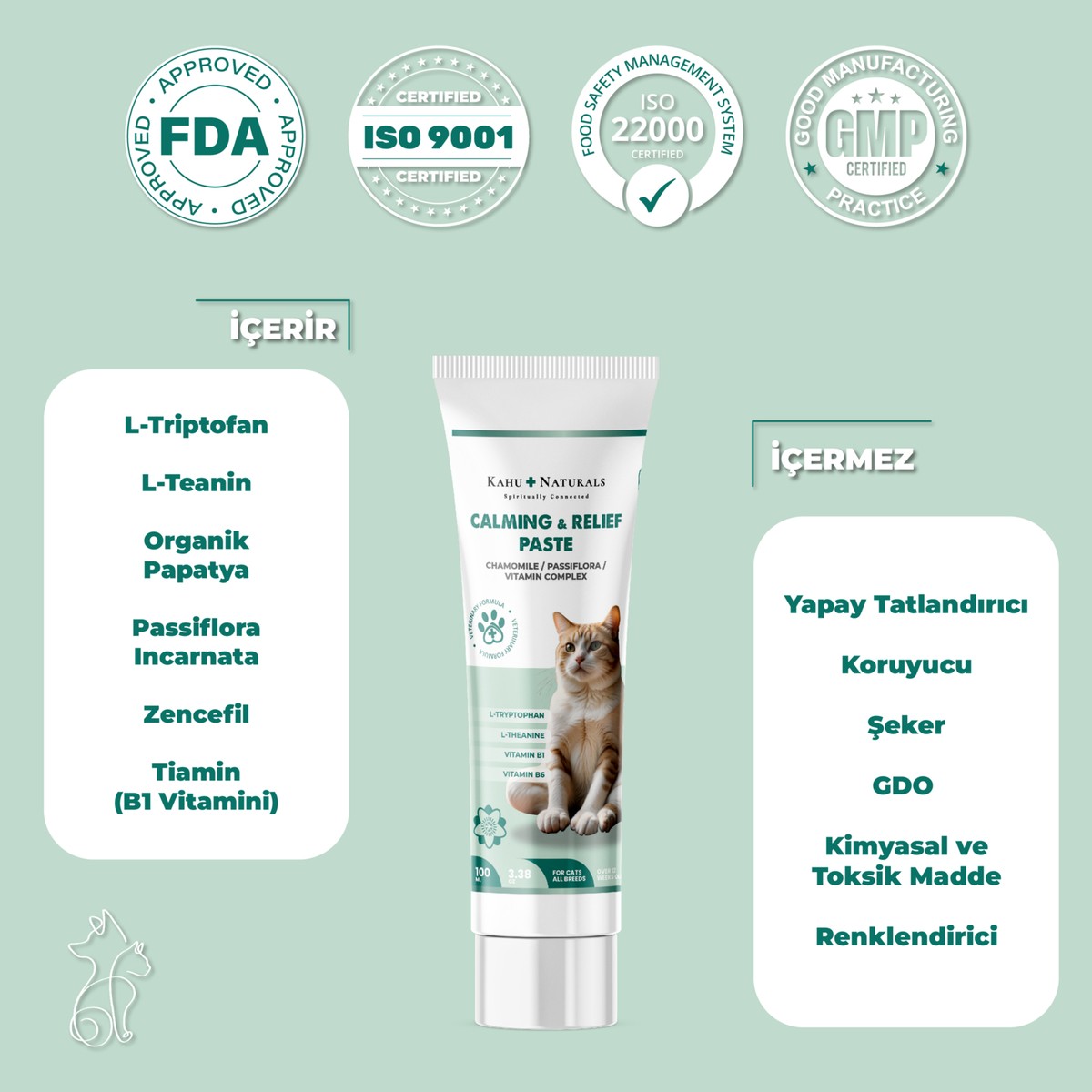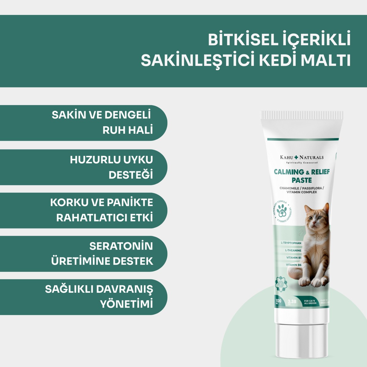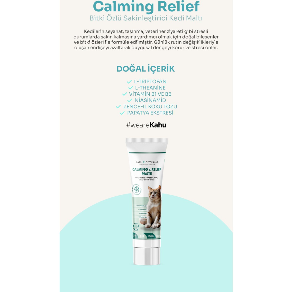 Kahu Naturals Calming Relief Bitki Özlü Sakinleştirici Kedi Maltı, Ayrılık, seyahat stresi, taşıt tutması, yeni insanlar veya hayvanlar ile tanışma, veteriner ve bakıcı ziyaretleri, fırtına, havai fişek, taşınma veya endişeye neden olabilecek diğer durumlar sırasında ve günlük rutinindeki değişikliklerin neden olduğu gerginliklerde kedilerin sakinliğini korumasına yardımcı olmak ve stresin vücutlarında yaratacağı olumsuzlukları önlemek üzere doğal bileşenler ve bitki özleri ile formüle edilmiştir.