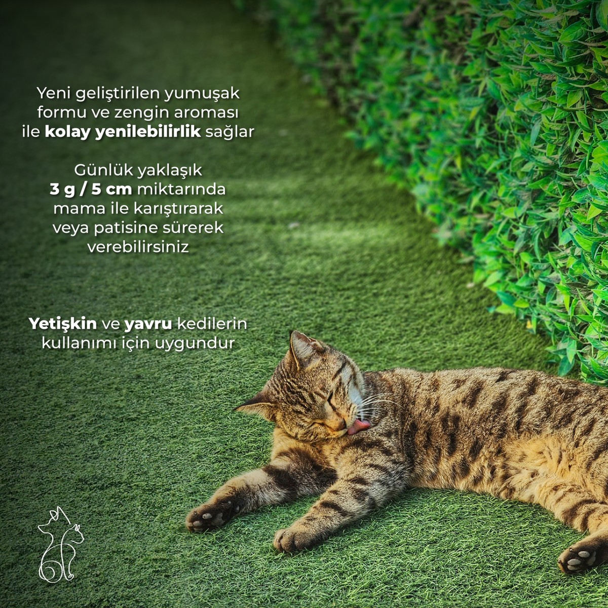 Doğrudan tüpten sıkarak veya mamalarına eklenerek kullanılabilir. Gerekli durumlarda 12 saat ara ile günde iki kez kullanılabilir. Oda sıcaklığında veriniz ve su kabında daima taze içme suyu bulundurunuz. 12 haftalıktan büyük kedilerin kullanımına uygundur. Ürünün maksimum faydasını görmek için düzenli olarak kullanmanızı ve veteriner hekiminize danışmanızı öneririz. Günlük olarak aynı saatte vermek, kedilerin rutinine uyum sağlamasına yardımcı olabilir.