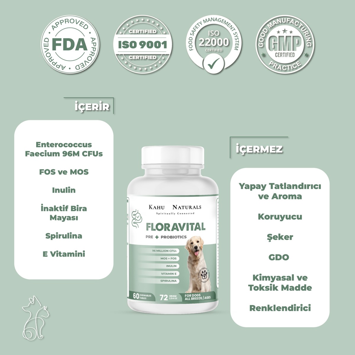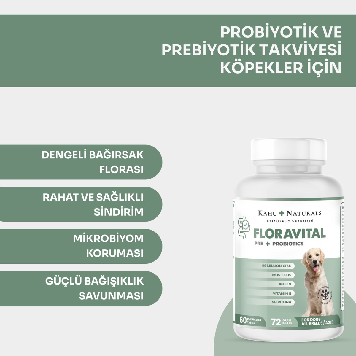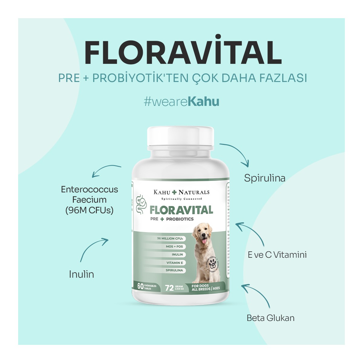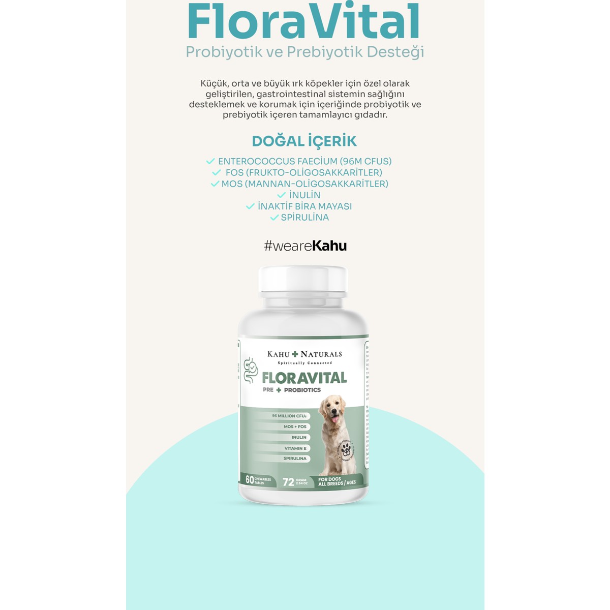 Kahu Naturals FloraVital, küçük, orta ve büyük ırk köpekler için özel olarak geliştirilen, gastrointestinal sistemin sağlığını desteklemek ve korumak için içeriğinde probiyotik ve prebiyotik içeren tamamlayıcı gıdadır.