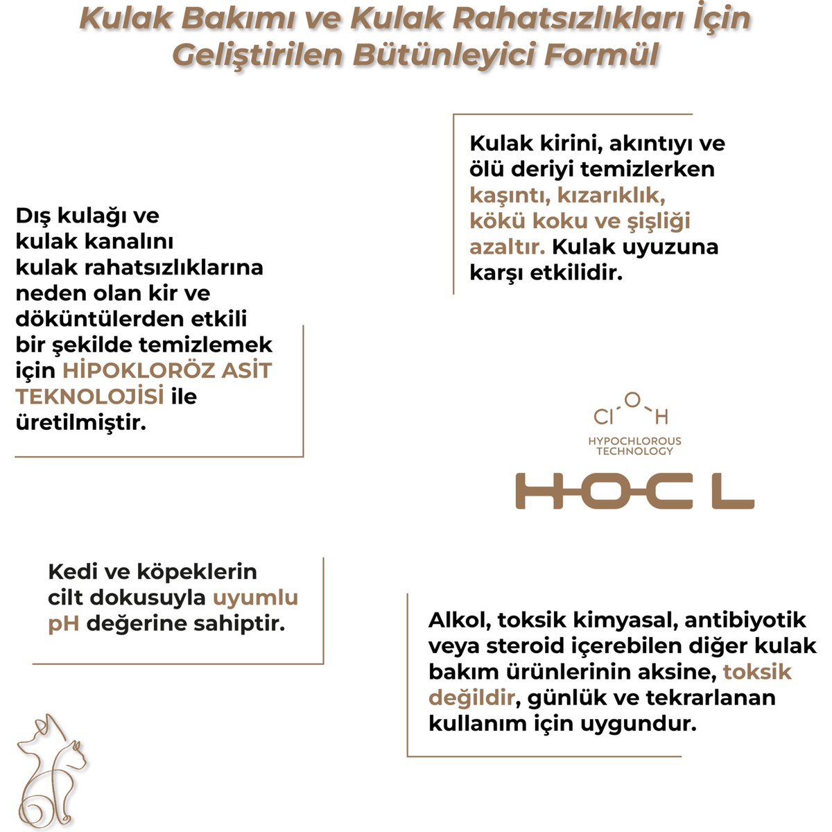 Doğal İçeriklerle Formül: İçerdiği Hipokloröz Asit, İnsanların Gözy Sıvısında Veya Kedilerin Kendilerini Ve Yavrularını Temizlemekte Kullandıkları Ağız Sıvılarında Bulunacak Kadar Doğal Ve Bir Moleküldür. Ana Etken İçeriği Hipokloröz Asit Olan Kahu Naturals Earcare Temizlik Sağlar.
