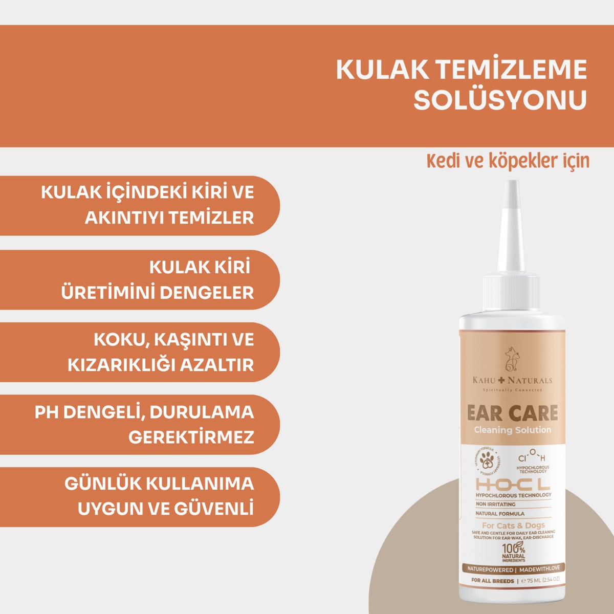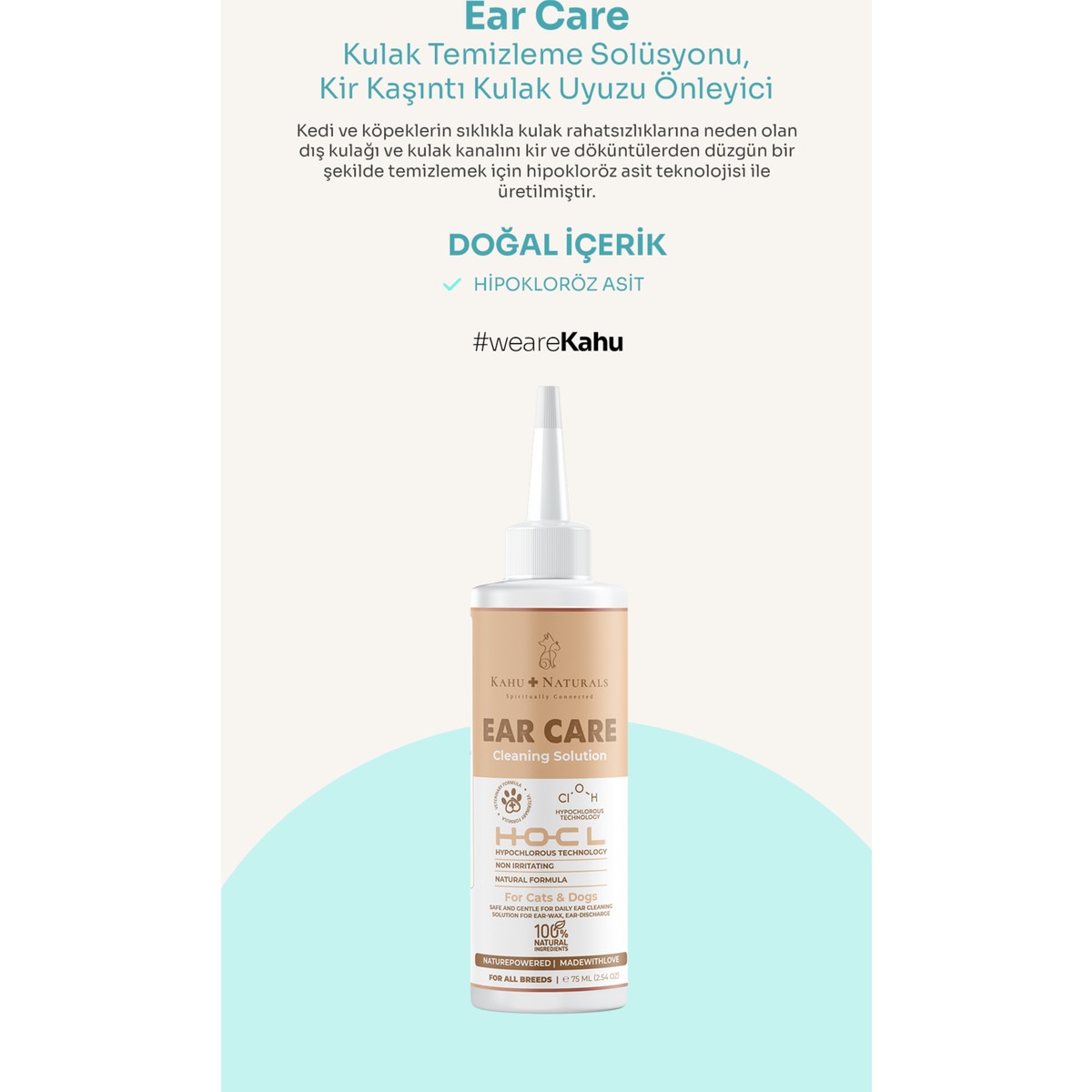 Kahu Naturals Kulak Temizleme Solüsyonu, Kedi Ve Köpeklerin Sıklıkla Kulak Larına Neden Olan Dış Kulağı Ve Kulak Kanalını Kir Ve lerden Düzgün Bir Şekilde Temizlemek İçin Hipokloröz Asit Teknolojisi İle Üretilmiştir. Alkol Veya Steroid İçermez, Tahriş Edici Değildir Bu Nedenle Günlük Ve Tekrarlanan Kullanım İçin Uygundur.