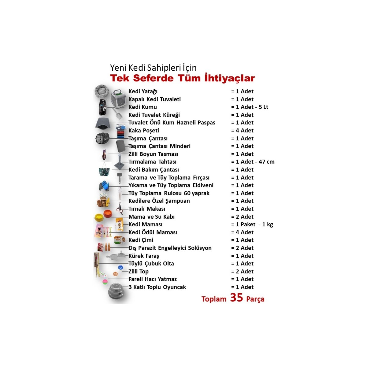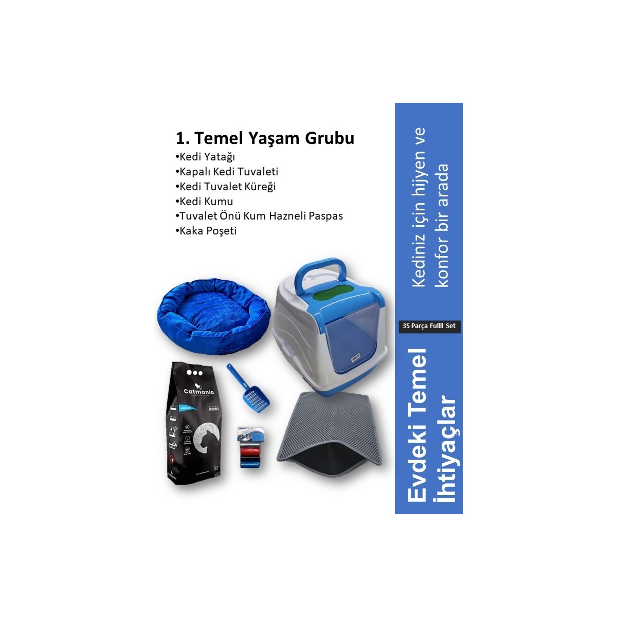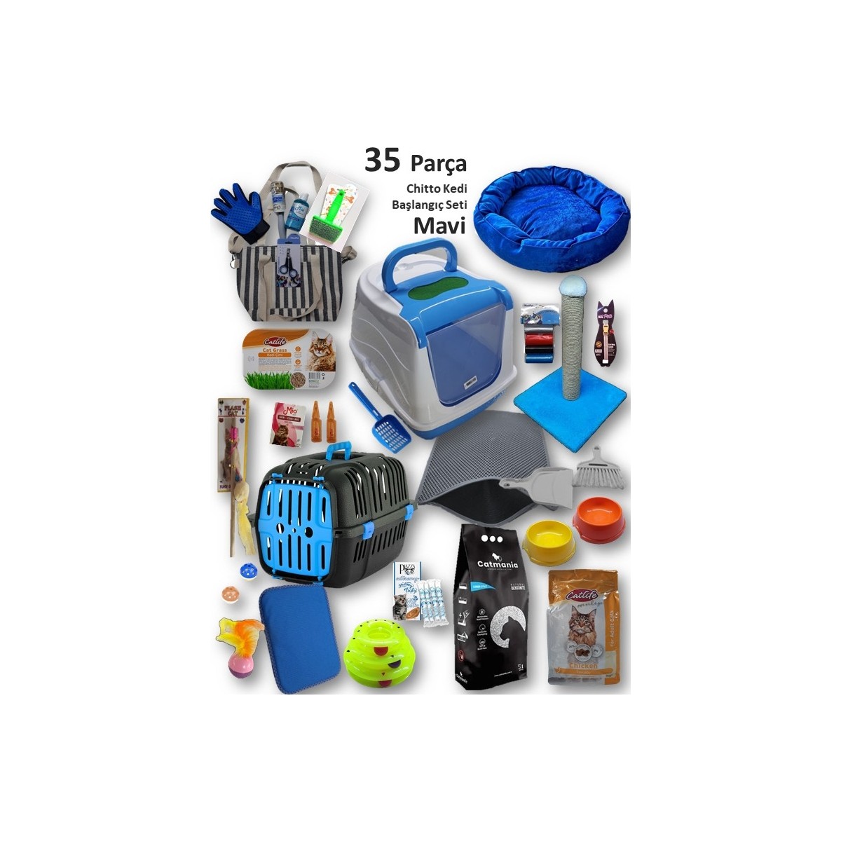İçeriğinde mama, tuvalet, oyuncak, taşıma çantası ve daha birçok gerekli malzeme bulunan bu set, kedinizin rahatlığı ve mutluluğu için özenle hazırlanmıştır.