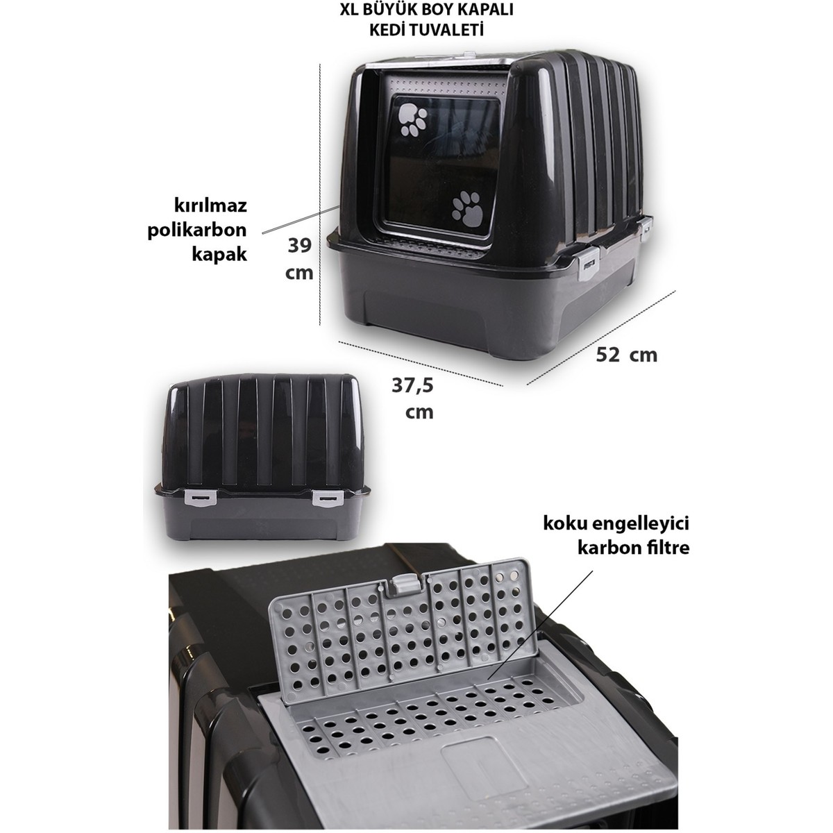 • LÜKS KAPALI KEDİ TUVALETİ: Kürek hediyelidir. Ön kapak ve taşıma kulpu özel kırılmaz polikarbon malzemeden üretilmiştir. Üst kısım çıkarılabilir. Bu sayede istenildiğinde açık tuvalet olarak kullanılabilir. Ve kolay temizleme sağlar. Ön kapağı yukarıya doğru açılabilir. Ürünün üst kısmında bulunan filtre özel olarak üretilmiştir ve içerisinde karbon bulunduğu için bu sayede kokuyu emer ve dışarı vermez. Ürün ölçüleri En: 37,5 Genişlik : 52 Yükseklik: 39. Pratik kapalı kedi tuvaleti 4 parçaya ayrılabilir, kullanım dışında saklaması kolaydır. Endişeli, sinirli kediler ve henüz kapalı tuvalet kullanmaya alışkın olmayan ve ürkek yavru kediler için idealdir. Evcil hayvanınızı yeni kapalı tuvaletine alıştırmanız için başlangıçta kapısını açık şekilde bırakabilirsiniz.