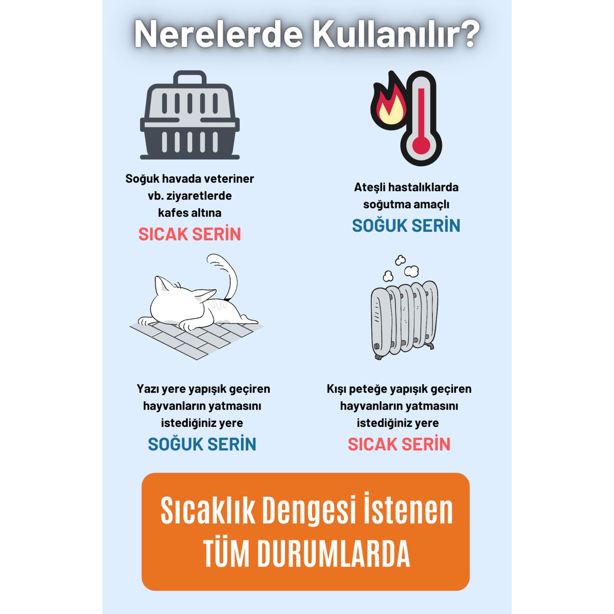 - Sıcak olmayan günlerde, ev dışı veteriner ziyareti benzeri tüm seyahatlerde taşıma kafesi altına sıcak olarak.