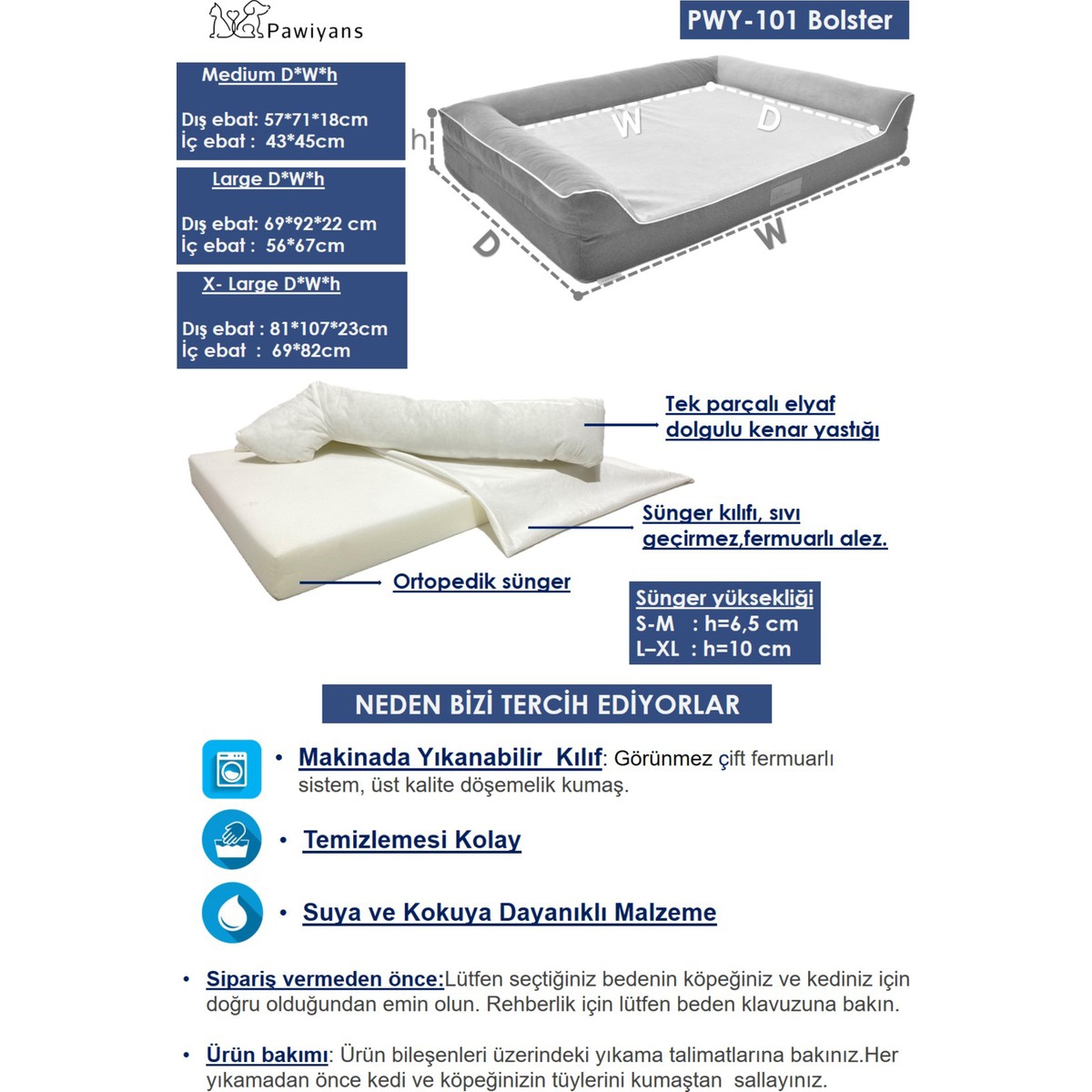 Pawiyans Bolster Üst Kalite Köpek Yatağı Süngerli Kılıflı Sıvı Geçirmez Alezli 2 Fermuarlı