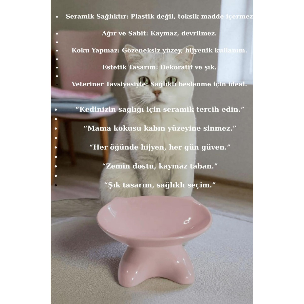 1. Özel tasarım seramik kedi ve köpek mama su kabı 2. Şık ve estetik görünüm sağlar 3. Dayanıklı ve uzun ömürlü malzeme kullanılmıştır 4. Hafif ve taşınması kolaydır 5. Hijyenik ve kolay temizlenebilir yüzeye sah