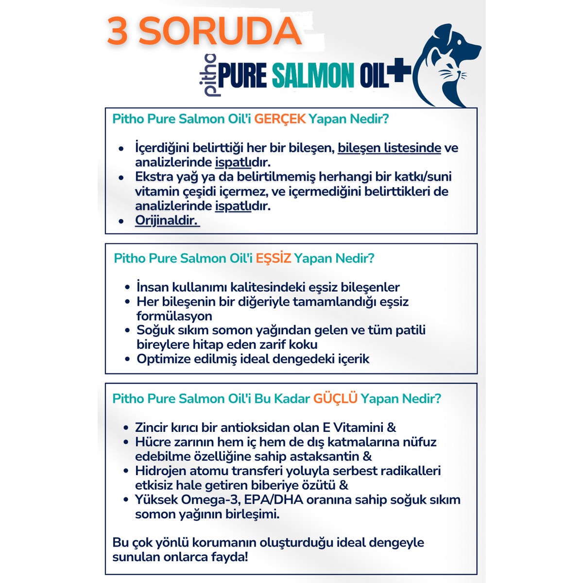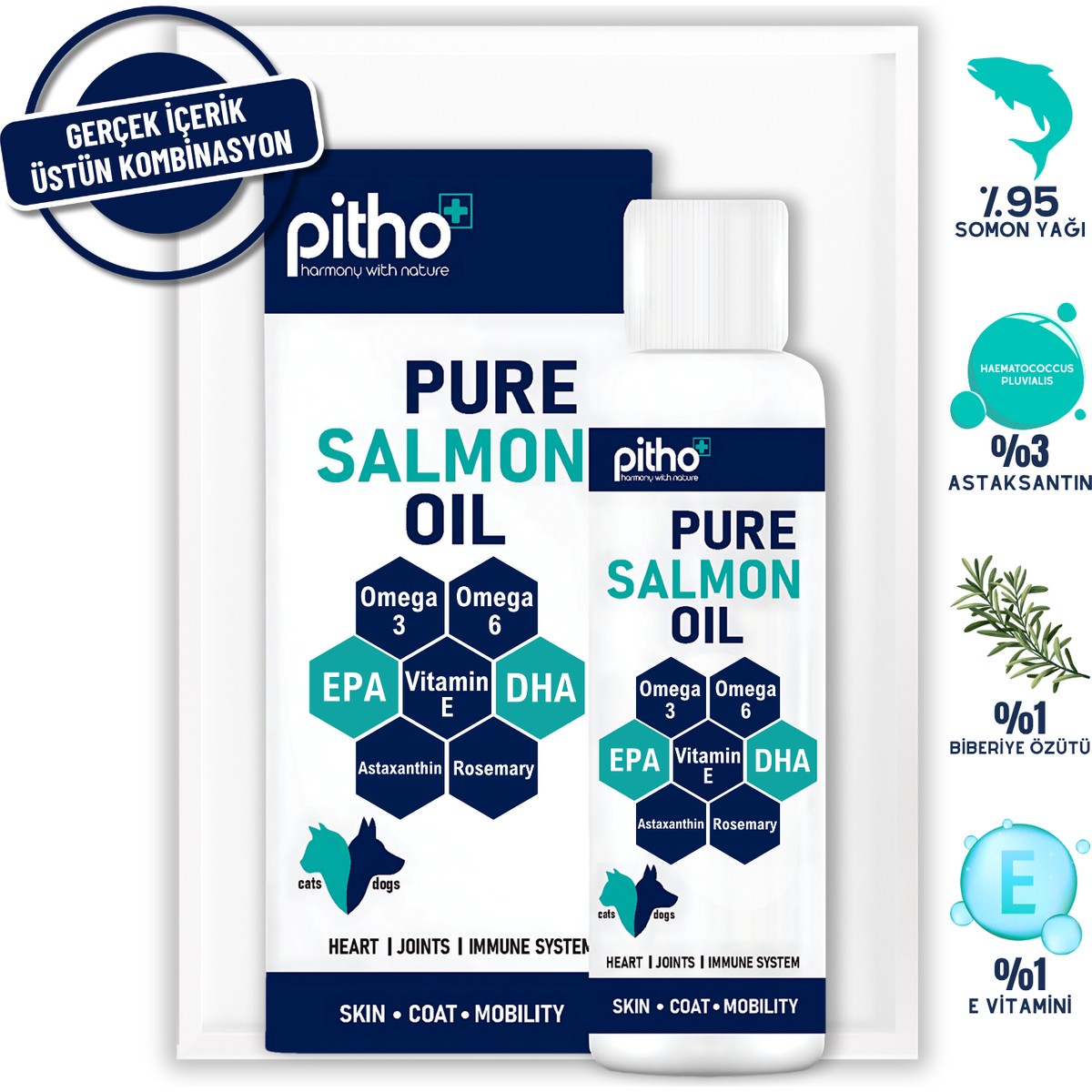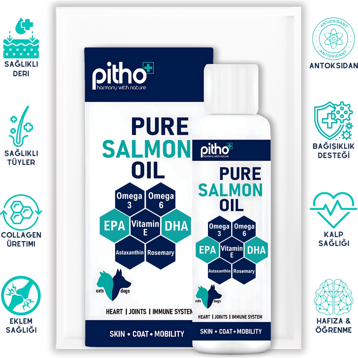 Pitho Pure Salmon Oil Somon Yağı, yüksek oranda Omega 3 içeren etkin EPA/DHA kaynağı olması, farklı mekanizmalarda etkili güçlü ve doğal antioksidanlar ile kontrollü Omega 6 içeriği sayesinde patili bireylerin: