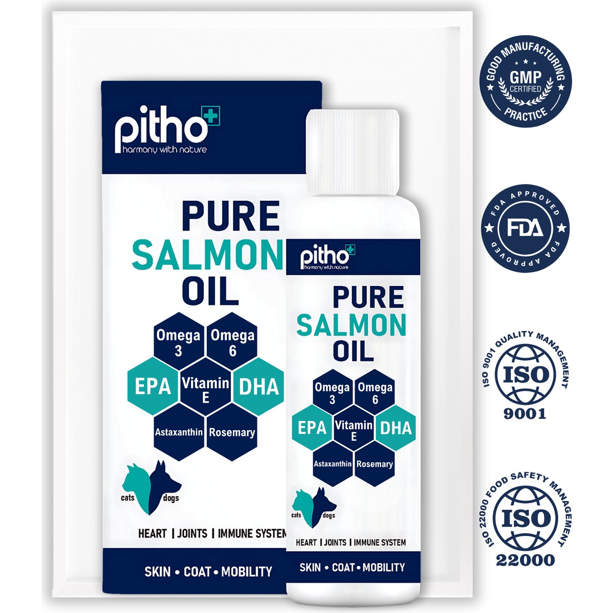 Pitho Pure Salmon Oil, kedilerin ve köpeklerin genel sağlığını kapsamlı bir şekilde desteklemek üzere tasarlanmış, %100 saf soğuk sıkım somon yağıdır. Eşsiz yapısına ek olarak Astaksantin, Biberiye Özütü ve E Vitamini içerir. Ekstra yağ veya belirtilmemiş hiçbir katkı/suni vitamin çeşidi içermez; içerdiği her bir bileşen, bileşen listesinde ve analizlerinde ispatlıdır. Tamamen saftır ve patili bireyler için maksimum güvenilirlik sunar.