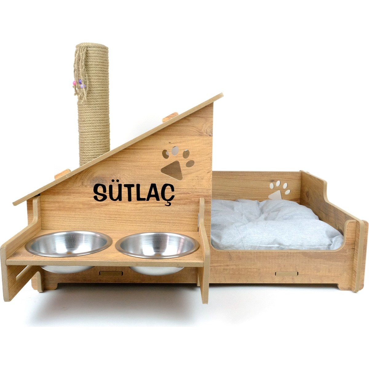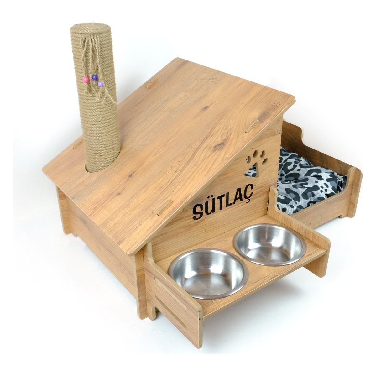 RealWood Ahşap, Çelik Mama Kaplı, Tırmalama Çubuklu Açık-Kapalı Kedi ve Köpek Evi 4 In 1
