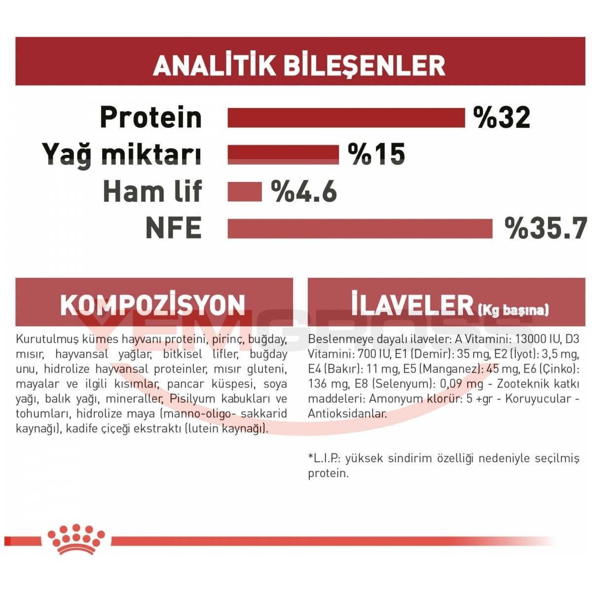 Dışarıda zaman geçirmek aktif bir kedinin bağışıklık sistemini stres altına sokabilir ve onu savunmasız bırakır. Özel tasarlanmış mama tanesi parçalanarak kolayca sindirilir ve mama yedikten sonra hareket etmeyi kesmeyen kediler için bu, özellikle önemlidir. FIT, 1 ila 7 yaş arası aktif kedilere yöneliktir. Doğru besin dengesini destekler. İdeal kiloyu destekler. Özel antioksidan kompleksi. Benzersiz halka biçimli mama tanesi kediyi mamayı daha yavaş tüketmeye ve çiğnemeye teşvik eder. Dengeli besin profili Yetişkinliğin tüm gerekliliklerini karşılamak için kediler yüksek kalitede beslenmeye ihtiyaç duyar. Fit 32 yetişkin kedilerin sağlığını korumak için doğru düzeyde yararlı besinler içerir. Sağlıklı kilo Yetişkin kedilerin ideal kilosunu korumaya yardımcı olmak üzere ayarlanmış kalori içeriği. Tüy yumağında azalma Özel lifler sayesinde yutulan tüylerin dışkıyla atılmasını sağlamaya yardımcı olur. Üriner sistem sağlığı Yetişkin bir kedinin üriner sistem sağlığını korumaya yardımcı olmak üzere formüle edilmiştir KOMPOZİSYON: Kurutulmuş kümes hayvanları proteinleri, pirinç, buğday, hayvansal yağlar, mısır, bitkisel lifler, buğday unu, hidrolize hayvansal proteinler, bitkisel protein izolat*, mısır gluten, mayalar ve ilgili parçalar, pancar küspesi, soya yağı, balık yağı, fsilyum kabuğu ve tohumları, mineraller, hidrolize maya (mannan-oligo-sakkarit kaynağı), kadife çiçeği özü (lutein kaynağı). BESLENME TALİMATI: Tabloya bakınız. Parti kodu, tescil numarası ve son kullanma tarihi için, ambalajin üzerine bakınız. Serin ve kuru bir yerde saklayınız. Royal Canin Turkey Evcil Hayvan Ürünleri Ticaret Limited Şirkaeti tarafından ithal edilmiştir. İLAVELER (her kg için): Beslenmeye dayalı ilaveler: Vitamin A: 13000 IU, Vitamin D3: 700 IU, E1 (Demir): 32 mg, E2 (İyot): 3,2 mg, E4 (Bakır): 10 mg, E5 (Manganez): 42 mg, E6 (Çinko): 126 mg, E8 (Selenyum): 0,08 mg – Zooteknik ilaveler: Amonyum klorid: 5 g – Koruyucular – Antioksidanlar. *L.I.P.: çok yüksek sindirilebilirlik özelliğinden dolayı seçilmiş protein