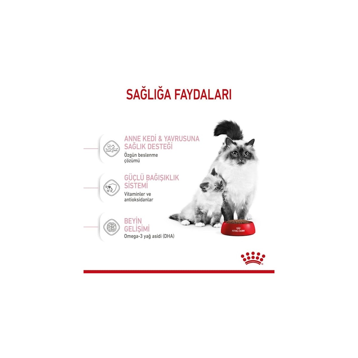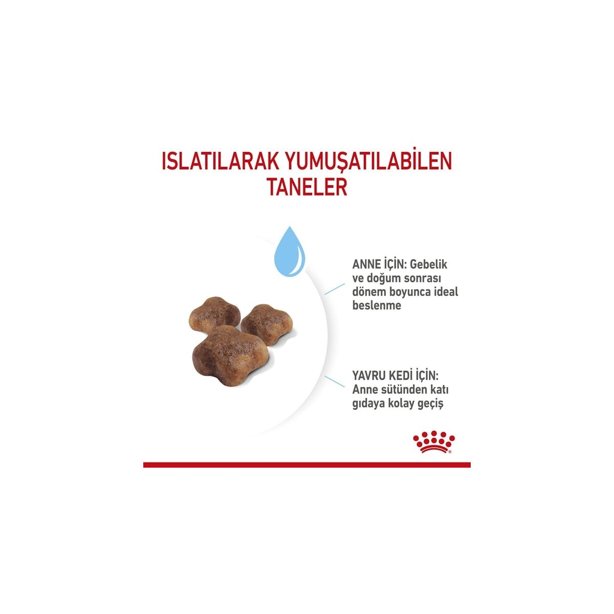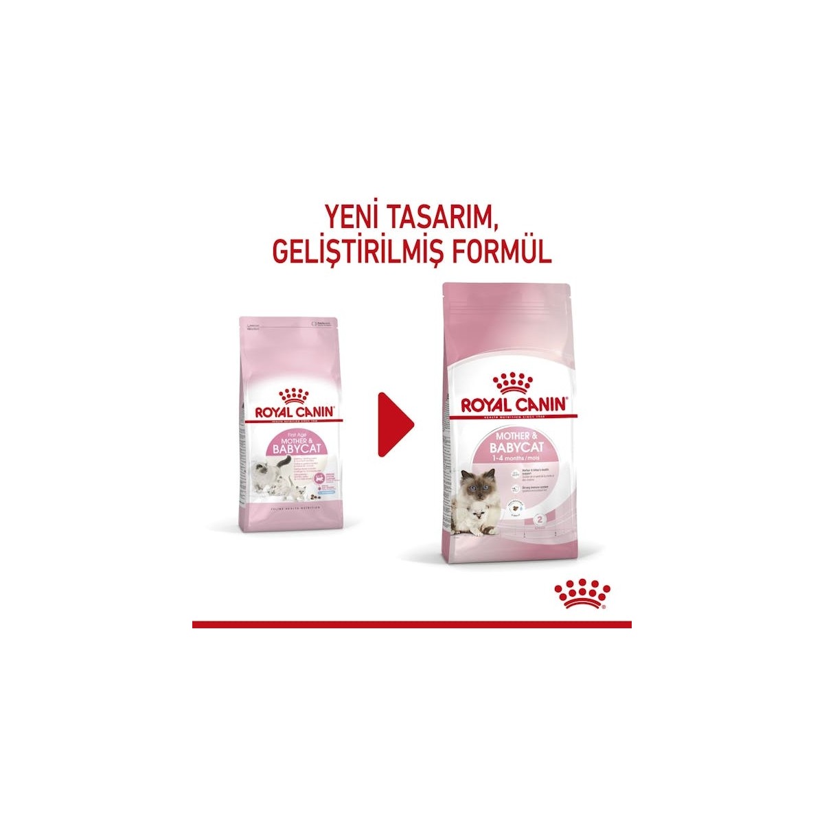 ROYAL CANIN® Mother & Babycat gebelik döneminde ve emzirme döneminde kedinizin yüksek enerji ihtiyaçlarını karşılamak için özel olarak hazırlanmıştır. Ayrıca anne sütüyle beslenen ve 4 aya kadar olan yavru kedilerin sağlıklı gelişmelerini desteklemek için formüle edilmiştir. Sağlıklı bağışıklık sistemi gelişimini desteklemek için Vitamin C ve E de dahil olmak üzere etkisi kanıtlanmış besin öğeleri içerir. Bu formül, yavru kedilerin beyin gelişimini ve göz sağlığını desteklemek için Omega-3 yağ asitleriyle (DHA) zenginleştirilmiştir. Faydalı prebiyotiklerin (MOS) ve çok yüksek sindirilebilirliği olan proteinlerin birleşimi sayesinde, ROYAL CANIN® Mother & Babycat aynı zamanda sindirim sağlığı açısından bağırsak mikrobiyotasının (bağırsak florası) sağlıklı dengesini desteklemeye yardımcı olur. ROYAL CANIN® Mother & Babycat’in taneleri suyla kolaylıkla ıslatılabilir ve böylelikle sütten kesilen yavru kedilerin su alımını desteklemek için ideal olan iştah artırıcı bir lapa kıvamı elde edilebilir. 16 hafta gibi kısa bir süre içerisinde, yavru kedileriniz bir sonraki büyüme evresinde beslenme gereksinimlerini karşılamak için özel olarak geliştirilen bir diyete ihtiyaç duyacaklar. Bu aşamada, yavru kediler için ROYAL CANIN® KITTEN formüllerine geçebilirsiniz. Yavru kedi formülleri, kuru mama ya da katı kıvamda ezme, soslu veya jöle kıvamında yaş mama formunda satışa sunulmaktadır. Onaylanmış Formül %96 yetiştirici memnuniyeti. (*2020 ve 2021 yıllarında gerçekleştirilen bir yetiştirici onay anketine dayanmaktadır. ) Özellikler Doğal antidoksidanlar içerir. Yapay renklendiriciler içermez. Yapay tatlandırıcılar içermez. Mother & Babycat’in Sağlık Desteği MOTHER & BABYCAT anne kedilerin gebelik ve laktasyon dönemlerindeki özel ihtiyaçlarını ve birinci büyüme dönemindeki yavru kedilerin özel ihtiyaçlarını karşılayacak şekilde formüle edilmiştir. Güçlü Bağışıklık Sistemi Etkinliği bilimsel olarak kanıtlanmış, E ve C vitaminleri de içeren özel kompleks sayesinde yavru kedilerin bağışıklık sistemlerini destekler. Beyin Gelişimi Omega 3 yağ asitleri (DHA) ile zenginleştirilmiş bu formül, yavru kedilerin beyin gelişimini ve sağlıklı görme fonksiyonlarını da destekler. Mikrobiyom Desteği Prebiyotik (MOS) kombinasyonu & yüksek sindirilebilirlikli proteinler sayesinde sağlıklı bağırsak mikrobiyotasını ve sindirim sağlığını destekler. KOMPOZİSYON: Kurutulmuş kümes hayvanları proteinleri, hayvansal yağlar, mısır unu, buğday gluten*, pirinç, hidrolize hayvansal proteinler, maya ürünleri, pancar küspesi, bitkisel lifler, soya yağı, mineraller, balık yağı, frukto-oligo-sakkaritler, hidrolize maya (manno-oligo-sakkarit ve beta-glukan kaynağı) (%0,30), alg yağı Schizochytrium sp. (DHA kaynağı), kadife çiçeği unu (lutein kaynağı). BESLENME TALİMATI: Tabloya bakınız. Parti kodu, tescil numarası ve son kullanma tarihi için, ambalajin üzerine bakınız. Serin ve kuru bir yerde saklayınız. Royal Canin Turkey Evcil Hayvan Ürünleri Ticaret Limited Şirketi tarafından ithal edilmiştir. İLAVELER (her kg için): Beslenmeye dayalı ilaveler: Vitamin A: 25500 IU, Vitamin D3: 1000 IU, Demir (3b103): 33 mg, İyot (3b201, 3b202): 3,3 mg, Bakır (3b405, 3b406): 10 mg, Manganez (3b502, 3b504): 43 mg, Çinko (3b603, 3b605, 3b606): 130 mg, Selenyum (3b801, 3b811, 3b812): 0,04 mg – Teknolojik ilaveler: Sedimanter kökenli klinoptilolit: 5 g – Koruyucular – Antioksidanlar. *L.I.P.: Çok yüksek sindirilebilirlik özelliğinden dolayı seçilmiş protein.