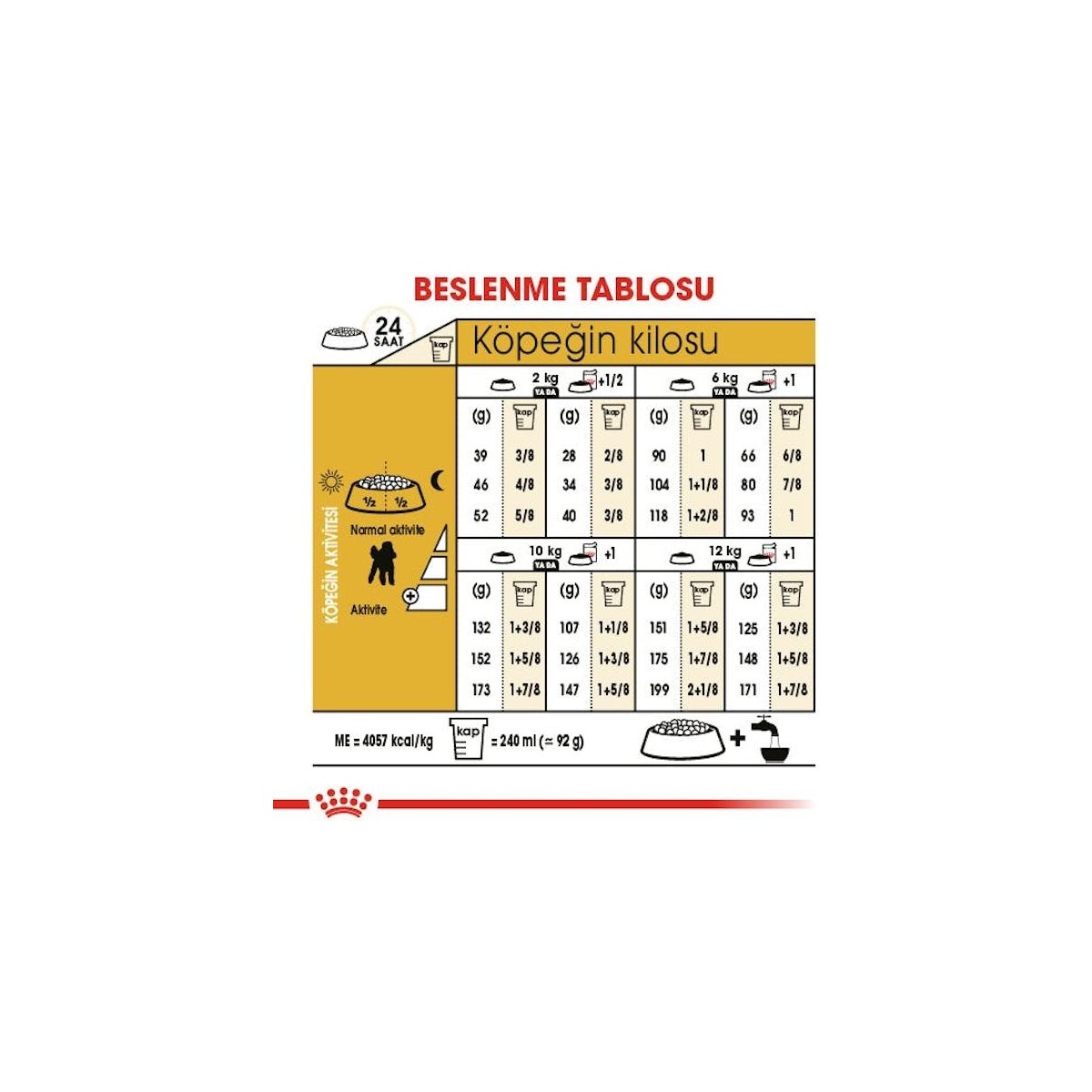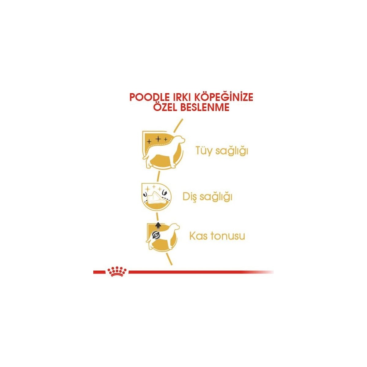 ROYAL CANIN® Breed Health Nutrition ürün gamı, ideal sağlığı korumak amacıyla her bir ırkın kendine özel beslenme ihtiyaçlarına yanıt verir. ROYAL CANIN® Poodle Adult, köpeğinizin tüm beslenme ihtiyaçları dikkate alınarak özel formüle edilmiştir. ROYAL CANIN® Poodle Adult, EPA ve DHA gibi Omega-3 yağ asitleri ile hodan yağı içerir. Bu besinler ve özel uyarlanmış protein içeriği, sağlıklı bir tüy büyümesinin desteklenmesine yardımcı olurlar. ROYAL CANIN® Poodle Adult, içerdiği kalsiyum şelatörleri sayesinde tartar oluşumunu ve yayılımını yavaşlatarak köpeğinizin diş sağlığını desteklemek için özel tasarlanmıştır. Bu formül, Poodle ırkı köpeğinizin kas tonusunun korunmasına da yardımcı olur. Her köpeğin bireysel tercihlerine yanıt verebilmek amacıyla, ROYAL CANIN® Poodle Adult, yumuşak ve lezzetli Loaf (katı kıvamda ezme ) kıvamıyla yaş mama olarak da bulunmaktadır. Karışık beslenme uygulamayı düşünüyorsanız, köpeğinizin ideal oranda ıslak ve kuru mama almasını sağlamak için beslenme yönergelerimizi inceleyin. Tüy sağlığı Bu formül, Poodle ırkı köpeğinizin kıvırcık tüylerinin sağlığının korunmasına yardımcı olan besin ögeleri içerir. Omega 3 yağ asitleri (EPA&DHA) ve hodan yağı ile zenginleştirilmiştir. Özel uyarlanmış protein içeriği, sağlıklı tüy uzamasını destekler. Diş sağlığı Bu formül, kalsiyum şelatörleri sayesinde tartar oluşumu riskinin azaltılmasına yardımcı olur. Kas tonusu Bu formül, Poodle ırkı köpeğinizin kas tonusunun korunmasına yardımcı olur. Özel tasarlanmış kuru mama tanesi Kuru mamanın şekli, büyüklüğü, yapısı ve formülü Poodle ırkı köpekler için özel olarak hazırlanmıştır. KOMPOZİSYON: Mısır, kurutulmuş kümes hayvanları proteinleri, bitkisel protein izolat*, hayvansal yağlar, pirinç, mısır unu, mısır gluten, hidrolize hayvansal proteinler, pancar küspesi, mineraller, soya yağı, balık yağı, mayalar ve ilgili parçalar, bitkisel lifler, frukto-oligo-sakkaritler, hodan yağı (%0,1), hidrolize edilmiş kabuklu hayvanlar (glukozamin kaynağı), kadife çiçeği özü (lutein kaynağı), hidrolize edilmiş kıkırdak (kondroitin kaynağı). BESLENME TALİMATI: Tabloya bakınız. Parti kodu, tescil numarası ve son kullanma tarihi için, ambalajin üzerine bakınız. Serin ve kuru bir yerde saklayınız. Royal Canin Turkey Evcil Hayvan Ürünleri Ticaret Limited Şirketi tarafından ithal edilmiştir. İLAVELER (her kg için): Beslenmeye dayalı ilaveler: Vitamin A: 29500 IU, Vitamin D3: 800 IU, E1 (Demir): 40 mg, E2 (İyot): 4 mg, E4 (Bakır): 12 mg, E5 (Manganez): 52 mg, E6 (Çinko): 139 mg, E8 (Selenyum): 0,08 mg – Teknolojik ilaveler: Sedimanter kökenli klinoptilolit: 5 g – Organoleptik ilaveler: Çay özü (polifenoller kaynağı): 150 mg – Koruyucular – Antioksidanlar. *L.I.P.: Çok yüksek sindirilebilirlik özelliğinden dolayı seçilmiş protein.