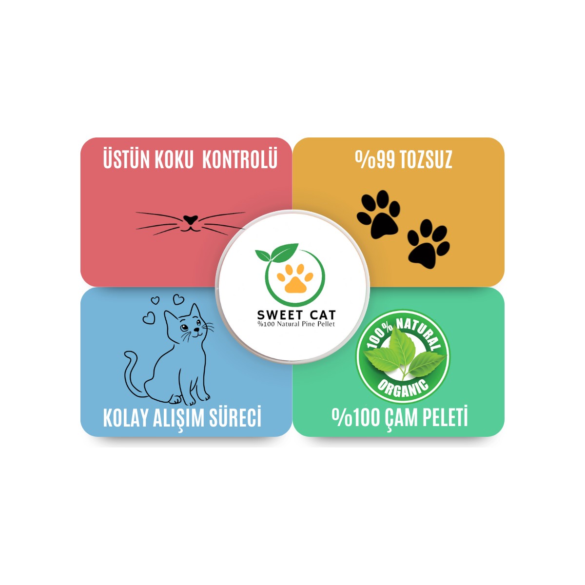 Sweet Cat Pellet Çam Peleti Kedi Kumu % 100 doğaldır ve Selüloz peletlerine göre yüksek emiciliğe ve hızlı absorvasyona sahiptir. Bu ürün dışkıyı kurutur ve bakteri oluşumunu engeller. Sweet cat Hijyenik ve sağlıklıdır. Herhangi bir toksit veya kimyasal içermez %100 çam talaşından imal edilmiştir %100 güvenilirdir. Ağaç kokulu kedi kumu doğal ve temizdir. Ayrıca kokuyu içine hapseder. Kötü kokuyu nötralize eder. doğal ağaç kokusu yayar. Kolay atılabilir kolay ve kullanılışlıdır. Kediniz tuvaletini rahatlıkla yapabilir. Tuvalete atılabilir. tıkama yapmaz. Yüksek absorpsiyon (emilim) 10 kg pelet, 50 litre suyu emer. Sizi her gün temizlik yapmaktan kurtarır. <u>Topaklanma yapmaz.</u>Toz içermez %99 tozsuzdur üretim aşamasında kullanılan granül yardımı ile talaş tozu en az seviyeye indirilmiştir. Bu sayede solunum sistemi üzerinde en az etkiye sahiptir. 6 mm çapında 1cm ile 2cm boyutlarındadır.