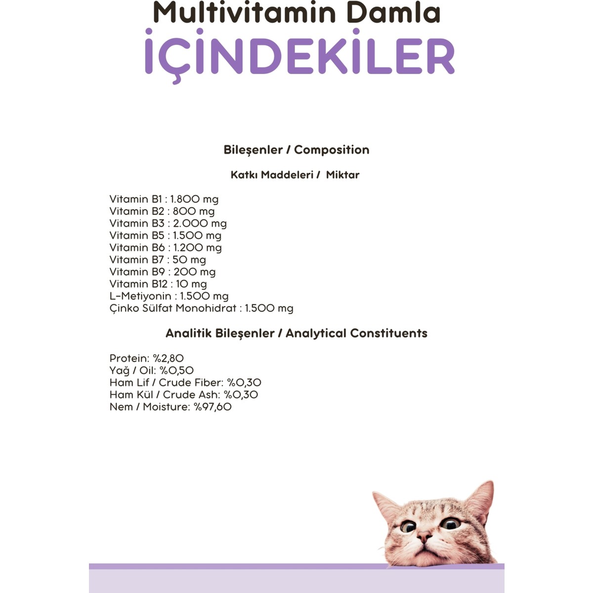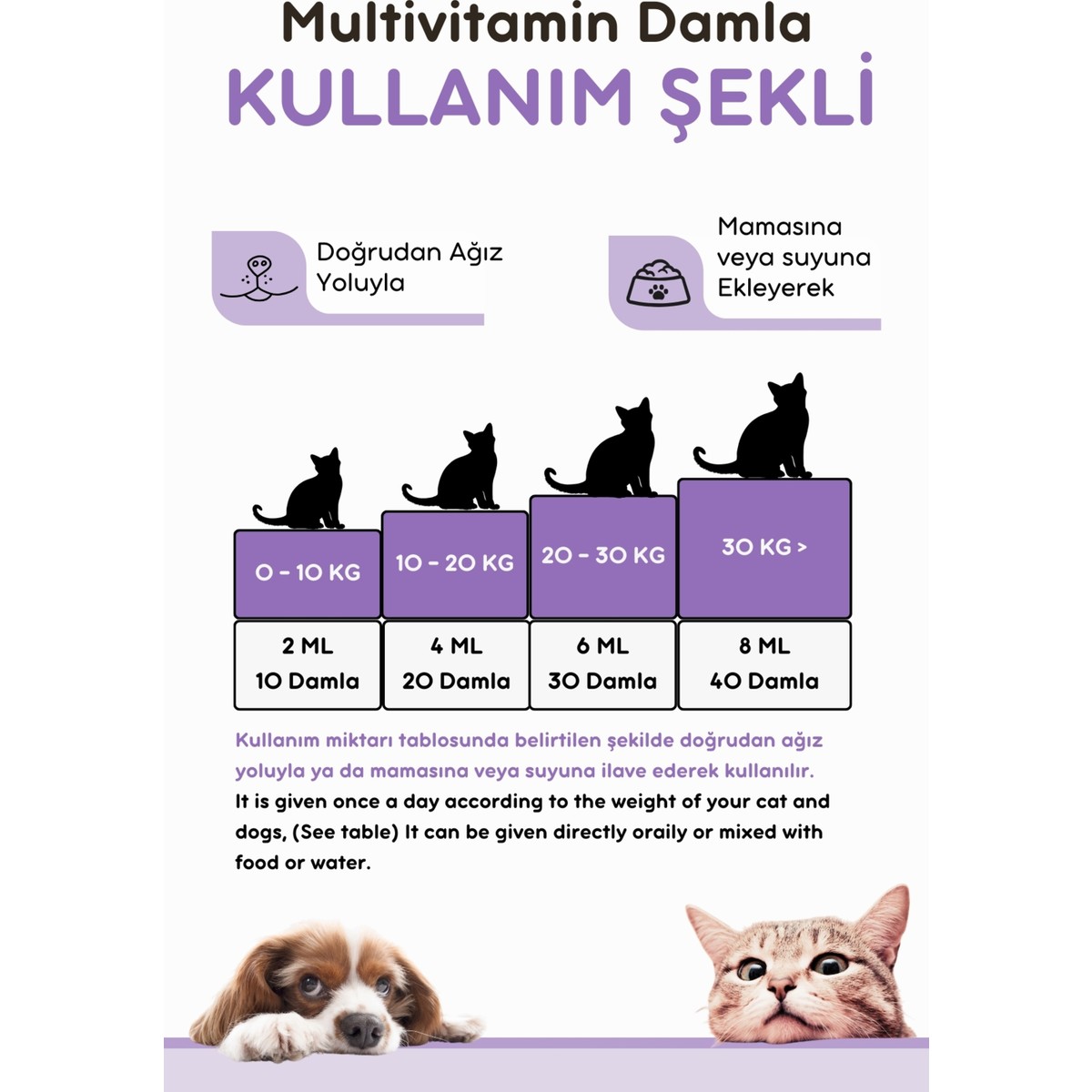 Kedinizin mamasına veya suyuna ilave edilerek kullanılır. 0-5 kg 1 ml (5 damla), 5+ kg 2 ml (10 damla) It is given by adding with water and food. 0-5 kg 1 ml (5 drops), 5+ kg 2 ml (10 drops)