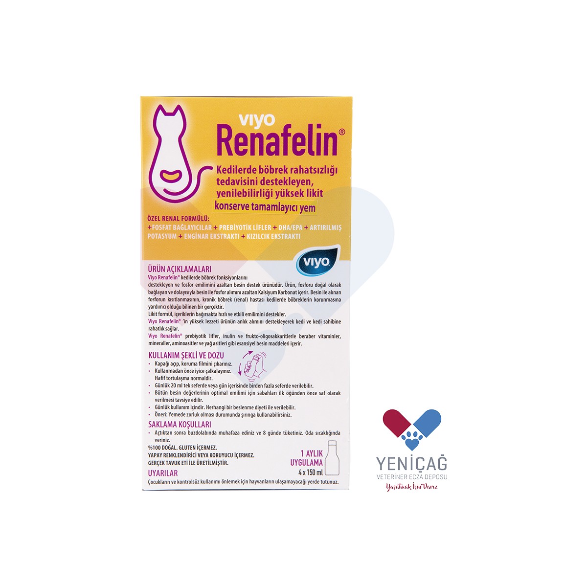 Viyo Renafelin® sadece kedilerin kullanımına uygundur. Özellikle böbrek fonksiyonları zayıflamış kediler için sıkıntı yaratabilecek ve normal gıdalarda bulunan fosfatların seviyesini azaltma etkisine sahiptir. Böbrek yetmezliği olan çok sayıda çalışma kedilerde fosfat alımının azaltılmasının faydalarını göstermiştir ve böbrek yetmezliği olan kedilerin yaşam süresi ve kalitelerinin, almış oldukları gıdalardan gelen fosfat miktarı ile doğrudan ilişkili olduğu günümüzde yaygın olarak kabul görmektedir.