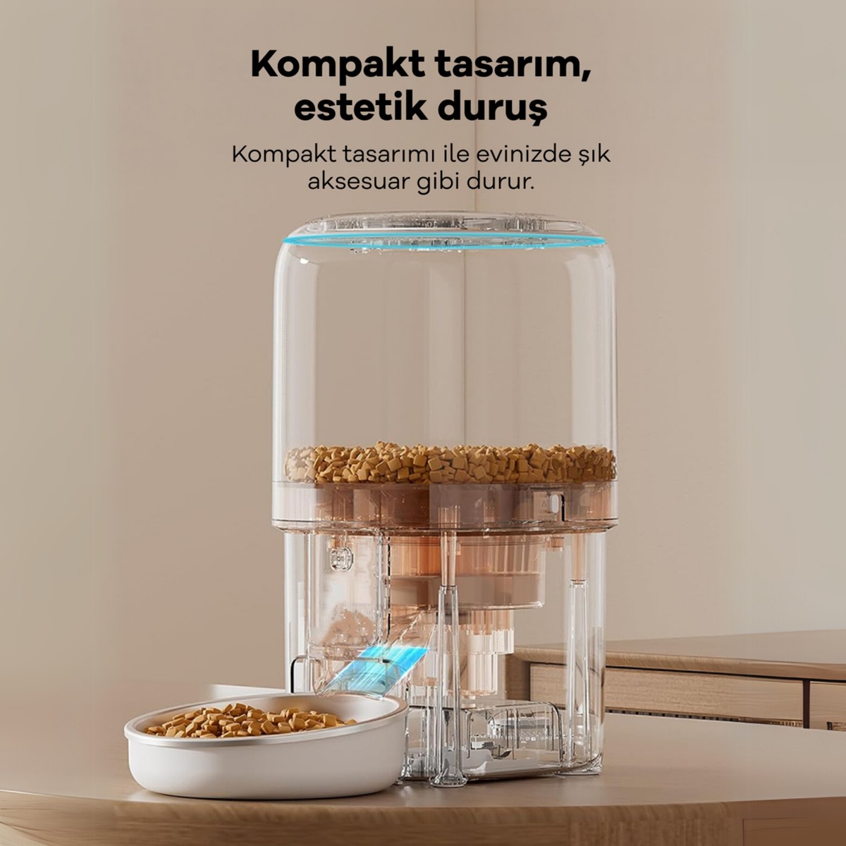 Ses kontrollü besleme: Komut algılama özelliğiyle ses ile mama bırakma seçeneği sunar; hijyenik ve pratik kullanım sağlar.